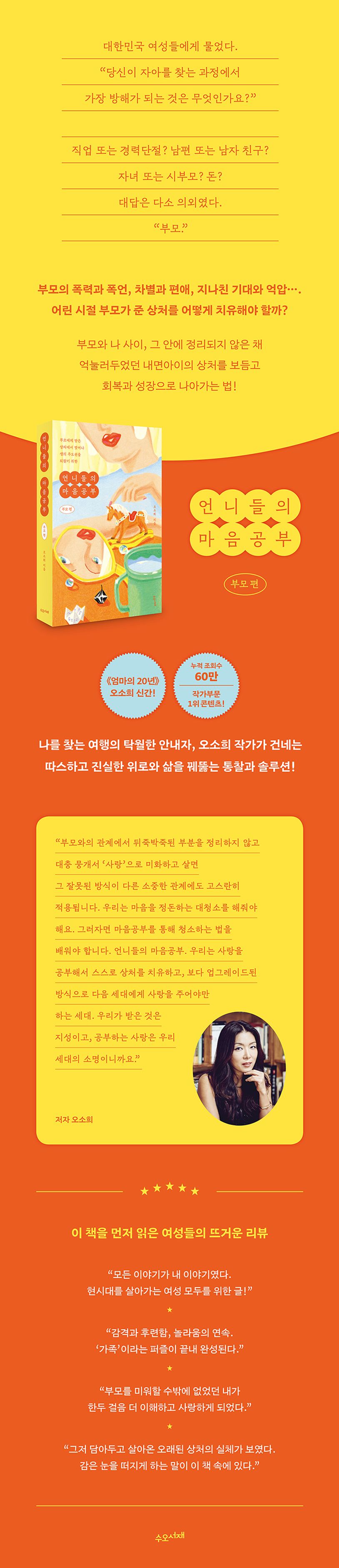 나는 왜 나에게 가장 매몰찰까? 왜 자꾸 인간관계에서 갈등을 겪을까? 왜 닮고 싶지 않았던 부모의 육아방식을 대물림할까? 어릴 적 받았던 부모의 폭력, 폭언, 차별, 편애, 방임 등으로 인한 상처는 성인이 된 후에도 고스란히 남아 현재의 삶을 어렵게 한다. 오소희 작가는 주체적이며 온전한 나를 되찾고자 모인 여성들과 함께 마음공부를 시작했다. 책에는 오래된 상처를 기꺼이 대면하고, 함께 치유하고, 용감하게 나아간 여성들의 이야기가 오롯이 담겨 있다.