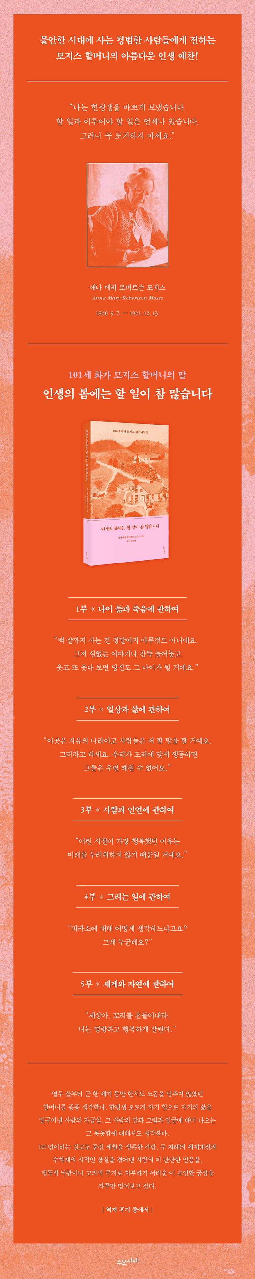 미국인이 가장 사랑하는 예술가 중 하나로 손꼽히는 화가, ‘모지스 할머니’로 불리는 애나 메리 로버트슨 모지스의 잠언집. 평생을 바지런히 일하다 70대 중반이 되어 그림을 그리기 시작했던 모지스 할머니, 앞치마를 두른 채 시골 농장에서 정겨운 그림을 그리는 할머니에 세상과 언론은 열광했다. 그녀에 관한 기사가 연일 쏟아졌으며, 라디오와 텔레비전 방송 출연부터 시작해 다큐멘터리까지 제작되었다. 하나의 문화 현상과도 같았던 할머니의 인기에는 입담도 크게 한몫했다. 그의 밝고 긍정적인 삶의 태도가 담긴 말들은 냉전 시대를 살아가는 이들에게, 외롭고 상처받은 이들에게 큰 위로가 되었고, 그는 금세 즐겁고 활기찬 노후의 아이콘으로 떠올랐다.