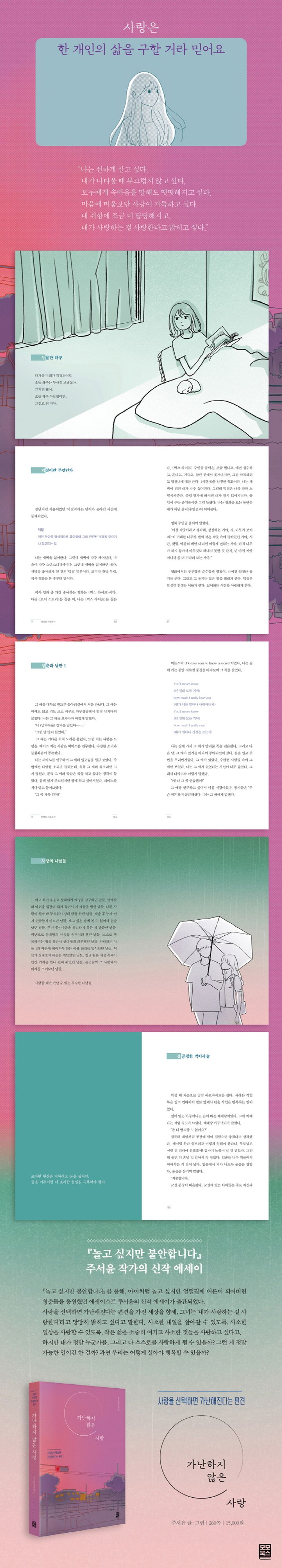 사랑을 선택하면 가난해진다는 편견을 가진 세상을 향해, 그녀는 ‘내가 사랑하는 걸 사랑한다’라고 당당히 밝히고 싶다고 말한다. 사소한 내일을 살아갈 수 있도록, 사소한 일상을 사랑할 수 있도록, 작은 삶을 소중히 여기고 사소한 것들을 사랑하고 싶다고.