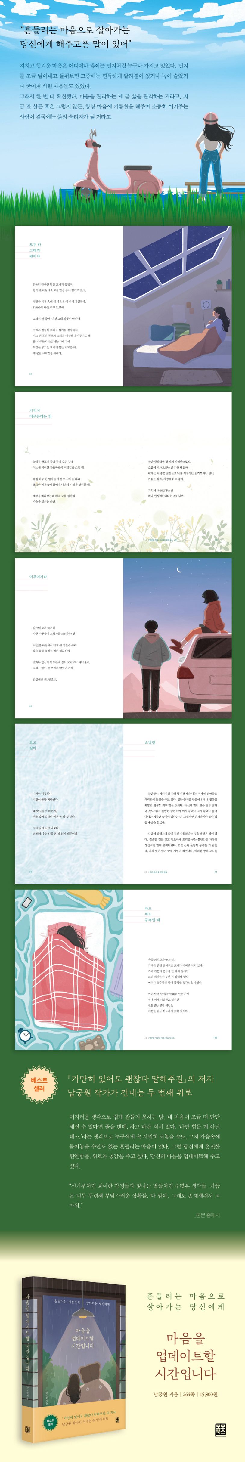 누구에게 속 시원히 터놓을 수도, 그저 가슴속에 묻어놓을 수만도 없는 흔들리는 마음이 있다. 어지러운 생각으로 쉽게 잠들지 못하는 밤이면 내 마음이 조금 더 단단해질 수 있기를 바라기도 했다. 그런 나에게 그리고 당신에게 온전한 편안함을, 위로와 공감을 주고 싶다. 당신의 마음을 업데이트해 주고 싶다.