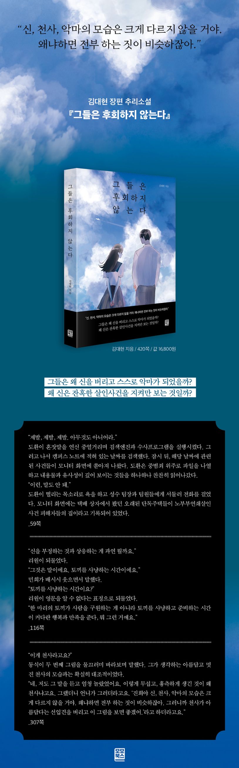 장편 추리소설 『그들은 후회하지 않는다』는 잔혹한 살인범, 그리고 뒤를 쫓는 자의 이야기다. 경찰서로 배달된 의문의 소포와 함께 시작되는 소설은, 마치 현실에서 벌어질 법한 살인사건들을 수면 위로 드러내면서 독자들을 몰입시킨다. 신을 부정하는 혹은 신에게 부정을 당한 인간의 뒷모습은 마지막 페이지까지 손을 놓지 못하게 한다.