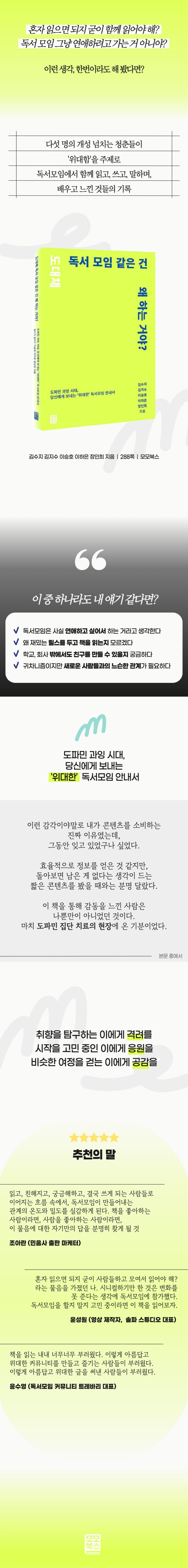 《도대체 독서 모임 같은 건 왜 하는 거야?》는 MZ 세대 다섯 명이 모여 함께 읽고 쓰고 나눈 시간을 담아낸 에세이다.