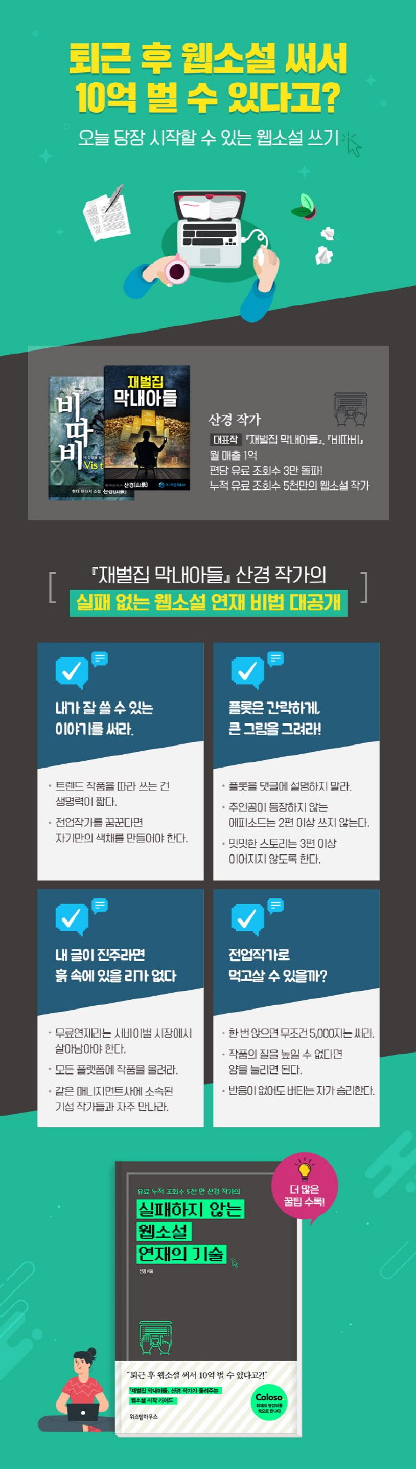 『재벌집 막내아들』로 엄청난 성공을 거둔 산경 작가가 웹소설 작가로 살아오며 터득한 것들을 공유하고자 집필한 책으로, 웹소설의 소재 선정부터 캐릭터 설정, 자료조사, 작품 구성법, 연재 시 꼭 지켜야 할 규칙, 작가로서의 마음가짐까지…… 산경 작가의 성공 비기를 하나도 빠짐없이 공개하고 있다. 특히 ‘내 글이 진주라면 흙 속에 있을 리가 없다’며 무료연재라는 서바이벌 시장에서 살아남는 법을 알려주고, ‘한번 컴퓨터 앞에 앉으면 무조건 5,000자를 쓰라’며 꿈만 꾸지 말고 지금 당장 웹소설 쓰기에 뛰어들 것을 독려한다. 때로는 인기 작품을 따라 쓰려는 추세에 따끔한 충고를 하면서도, ‘반응이 없어도 버티는 자가 승리한다’며 용기를 준다.