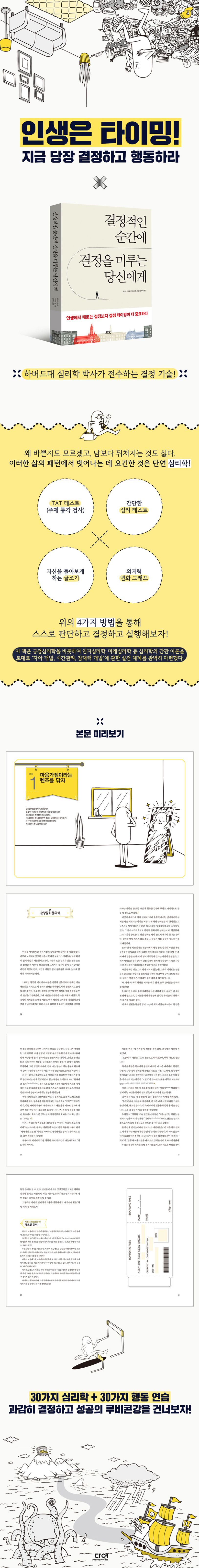 우리의 일상은 즉흥연주와 다르지 않다. 망설임으로 초래되는 근심은 에너지만 갉아먹을 뿐이다. 충분히 생각했고, 충분한 자료도 찾았다면 결정을 내려라! 그리고 행동하라. 앞으로 나아가기 위해 에너지를 할애하는 것이야말로 올바른 정신관리법이다. 긍정심리학, 인지심리학, 미래심리학 등 심리학의 간판 이론을 토대로 한 이 책이 그 길을 밝혀줄 것이다.