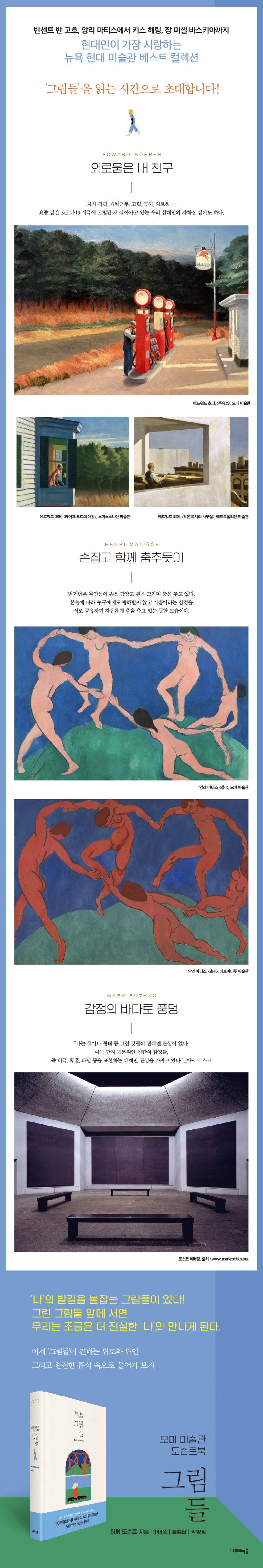코로나19, 자가 격리, 재택근무…, 그로 인해 답답함과 고립감, 공허함과 외로움을 느끼는 현대인들에게 청량감을 선물해 줄 예술 교양서 《그림들 : 모마 미술관 도슨트북》이 출간되었다. 이 책은 모마 미술관 도슨트북이라는 부제에서 알 수 있듯이, 현대인들이 가장 사랑하는 뉴욕 현대 미술관 모마의 작품들 중에서도 ‘모마에 가면 반드시 봐야 할 대표 작품들’을 미국 현지의 그림 해설가가 직접 엄선해 친절하게 소개하고 있다. 특히 저자는 지금까지 약 1,700여 회 도슨트를 진행한 전문 그림 해설가답게 독자들이 마치 미술관 현장에서 직접 작품 설명을 듣는 것처럼 쉽고 생생하게 스토리텔링을 곁들여 작품 해설을 하고 있다.