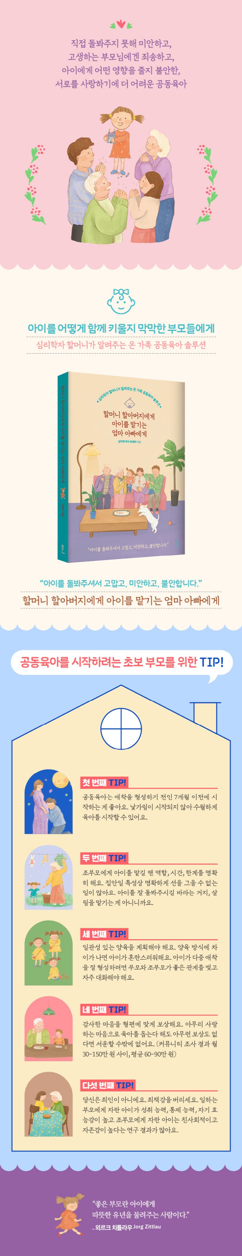 부모 편과 조부모 편으로 나누어진 이 책에는 조부모와 어떻게 육아를 함께 해나가야 할지 막막하고, 아이에게 어떤 특성을 길러주어야 할지 몰라 당황하는 초보 부모와 요즘 육아법을 잘 몰라 손주를 돌보기 힘들어하고, 아이 부모와도 부딪히는 조부모를 위한 실용적이고 조화로운 공동양육 방안이 담겨 있다.