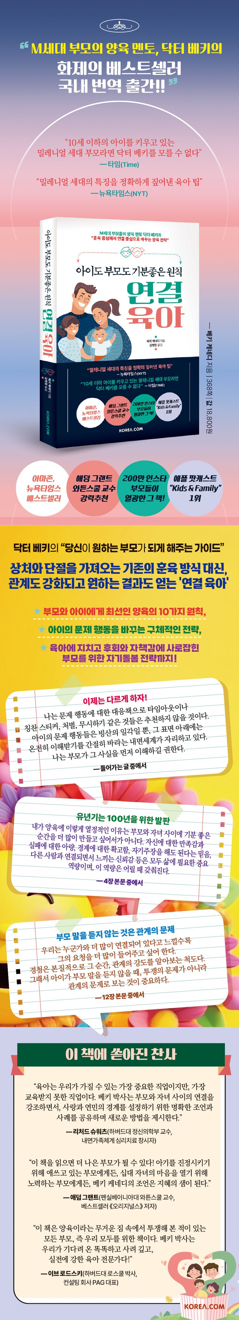 많은 부모들이 육아에서 길을 잃고, 지치고, 아이를 망치게 될까 걱정하며 양육의 어려움을 호소한다. 아이의 문제 행동을 바로잡기 위해 검증되었다고 인정받는 양육 방식을 적용해도 아이와의 거리만 멀어질 뿐, 훈육에 성공하기가 쉽지 않기 때문이다. 이 책의 저자 베키 케네디는 행동 교정 중심이 아닌, 부모와 자녀 사이의 유대감을 먼저 쌓는 ‘연결’ 중심의 양육법을 제안한다. 미국 밀레니얼 세대 부모들로부터 폭발적인 반응을 얻고 있는 베키 케네디는 미국에서 부모들의 절대적인 지지와 함께 권위를 인정받는 양육 전문가다. 베키 박사는 아이의 문제 행동을 개선하기 위해 부모와 자녀 사이의 연결 감정을 우선한 전략을 내세운다. 양육의 목표는 행동 교정이 아니라, 한 인간을 바르게 키우는 것이기 때문에 상처와 단절을 가져오는 기존의 훈육 방식은 달라져야 한다는 것이다. 베키 박사는 이 책에서 부모와 아이 모두에게 최선인 양육의 10가지 원칙과 아이의 문제 행동을 바꾸기 위해 부모가 따라하고 바로 써먹을 수 있는 구체적인 전략들을 소개한다.