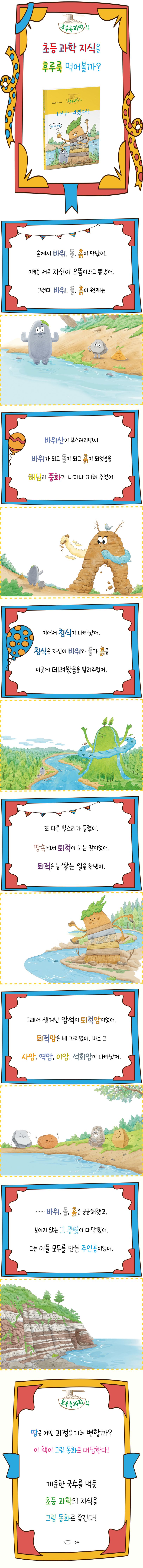 이 책의 부제는 ‘지표의 변화’이다. ‘지표의 변화’는 초등 과학 교과의 중요한 단원 주제이다. 초등 과학 수업에서는 ‘지표의 변화’를 ‘풍화, 침식, 퇴적’의 자연 현상을 학생들이 개념적으로 구분할 수 있도록 교육시킨다. 또한 ‘사암, 이암, 역암, 석회암’으로 구분되는 퇴적암에 대하여도 학습시킨다. 바로 이 교육 주제를 ‘후루룩 과학’ 시리즈의 네 번째 책이 그림 동화 이야기로 흥미롭게 형상화하였다. 따라서, 어린이 독자는 이 책을 통하여 초등 과학의 핵심 지식을 이야기로 즐기며 이해할 수 있다.