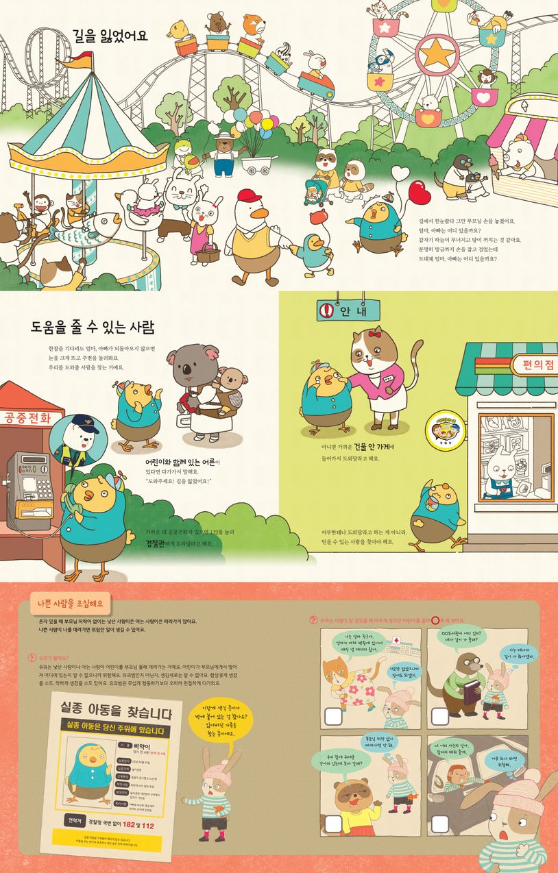 길에서 한눈팔다 그만 부모님 손을 놓쳤어요. 엄마, 아빠는 어디 있을까요? 큰 소리로 울음이 나오려고 해요. 길을 가다 이런 일이 벌어지면 그 자리에 우뚝 서요. 엄마, 아빠가 나를 찾느라 왔던 길을 돌아올 테니까요. 한참을 기다려도 함께 온 사람이 되돌아오지 않으면 주변에 어린이와 함께 있는 어른, 건물 안 가게, 공중전화로 112를 눌러 경찰관에게 도움을 요청해요. 평소에는 익숙한 동네라 해도 사람 없고 으슥한 곳에 가지 않아요. 남의 차에 덥석 타지도 않고요. 나쁜 사람은 겉모습만 봐서는 우리에게 나쁜 짓을 할 사람인지 알기 어려워요. 악당은 우리를 깜빡 속이려고 좋은 사람인 척하기도 한다고요. 이렇게 유괴와 미아처럼 위험한 상황을 피하고 대처하는 방법에 대해 상세히 알아보아요.