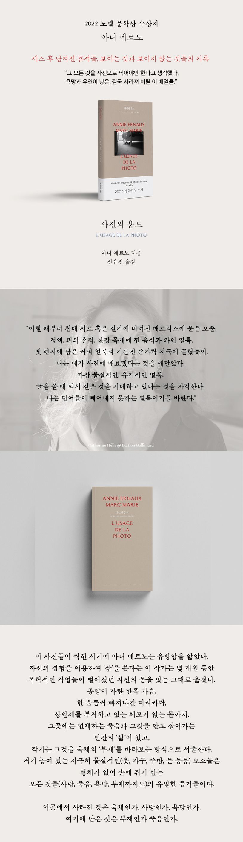 아니 에르노와 그녀의 연인인 마크 마리가 함께, 관계 후 어지러진 풍경을 사진 찍고 사진 위로 보이는 것과 보이지 않는 것들을 글로 담은 이 책은 사랑을 나누고 난 후 남은 흔적들의 기록이다. 행위와 육체가 자취를 감추고 난 후 그곳에 남겨진 잔해들을 통해 읽는 어제의 욕망과 오늘의 부재, 그리고 죽음이라는 내일의 전조를 기록한 글로 쓴 사진들.