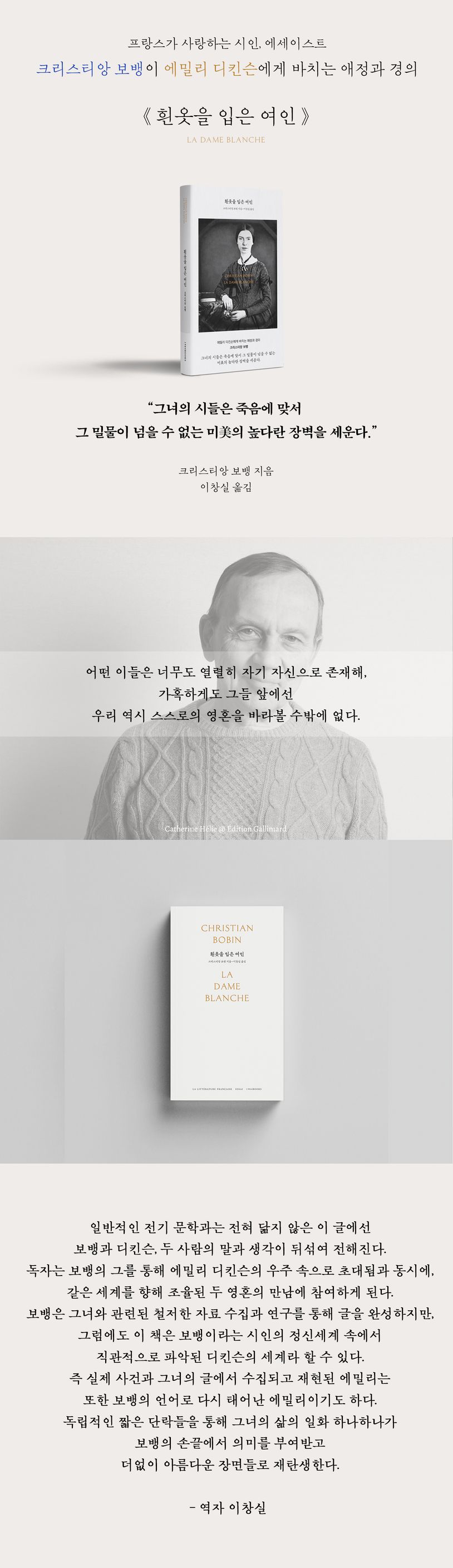 『 흰옷을 입은 여인』은 프랑스 작가 크리스티앙 보뱅(19541-2022)이 19세기를 살았던 미국 시인 에밀리 디킨슨(1830-1886)에게 바치는 애정과 경의요, 한 편의 시적 전기물이다. 세상의 소음과 영예를 병적으로 회피하며 글쓰기 안에 은둔했던 여인, 무수한 상喪을 겪으며 죽음에 사로잡혀 있으면서도 비밀스러운 영감에 차 있었던 여인, 자신의 집 울타리를 삶의 경계로 삼아, 정원을 가꾸고 가족의 빵을 굽고 심신이 쇠약해 가는 어머니를 돌보고 수많은 편지를 쓰면서 하루하루의 삶 자체가 시가 되게 했던 여인, 발표할 생각도 없는 글들을 오로지 자신만을 위해 썼고, 그것들을 통해 보이지 않는 존재인 ‘영원’을 우리에게 가리켜 보인 여인, 에밀리 디킨슨. 일반적인 전기 문학과는 전혀 닮지 않은 이 글에선 보뱅과 디킨슨, 두 사람의 말과 생각이 뒤섞여 전해진다. 독자는 보뱅의 글을 통해 에밀리 디킨슨의 우주 속으로 초대됨과 동시에, 같은 세계를 향해 조율된 두 영혼의 만남에 참여하게 된다. 보뱅은 그녀와 관련된 철저한 자료 수집과 연구를 통해 글을 완성하지만, 그럼에도 이 책은 보뱅이라는 시인의 정신세계 속에서 직관적으로 파악된 디킨슨의 세계라 할 수 있다. 즉 실제 사건과 그녀의 글에서 수집되고 재현된 에밀리는 또한 보뱅의 언어로 다시 태어난 에밀리이기도 하다. 독립적인 짧은 단락들을 통해 그녀의 삶의 일화 하나하나가 보뱅의 손끝에서 의미를 부여받고 더없이 아름다운 장면들로 재탄생한다.