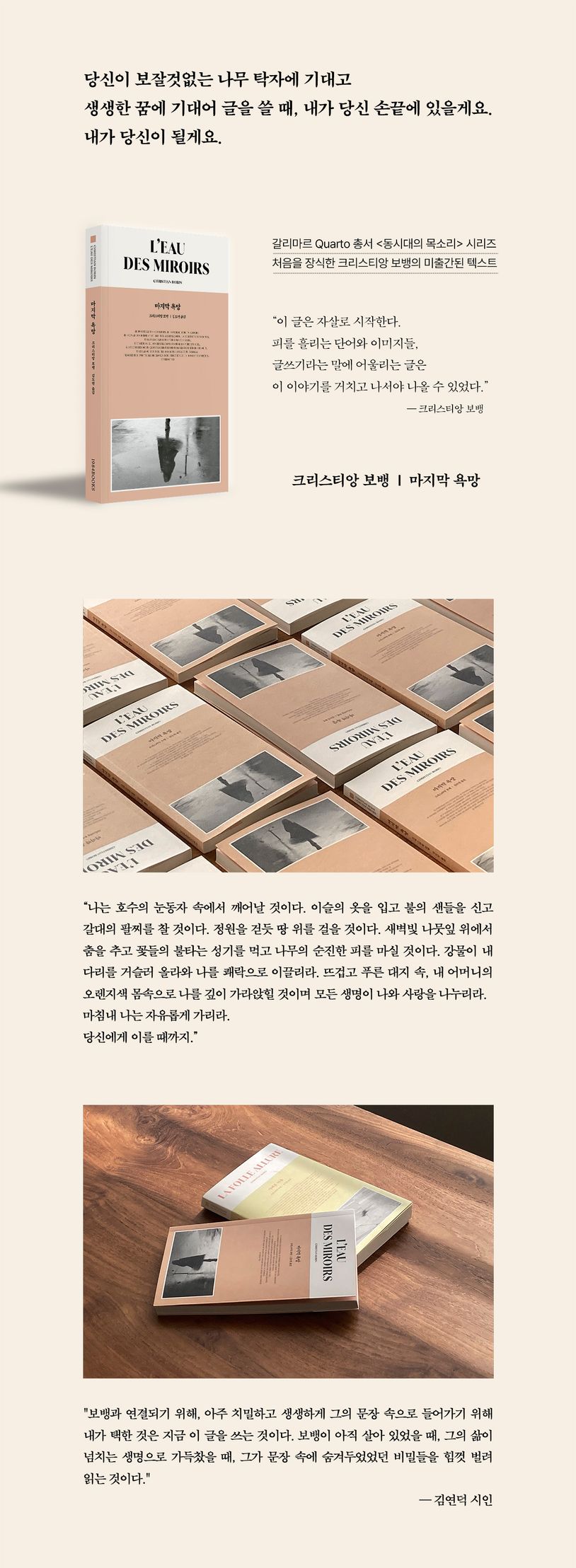 『작은 파티 드레스』 『환희의 인간』 『가벼운 마음』 등 국내에 출간된 소설과 에세이로 독자들의 많은 사랑을 받아온 프랑스 작가 크리스티앙 보뱅의 소설 『마지막 욕망』이 출간되었다. 2022년부터 새롭게 기획된 프랑스 출판사 갈리마르 총서 QUARTO 〈동시대의 목소리〉 시리즈의 처음을 여는 작품이기도 하다.