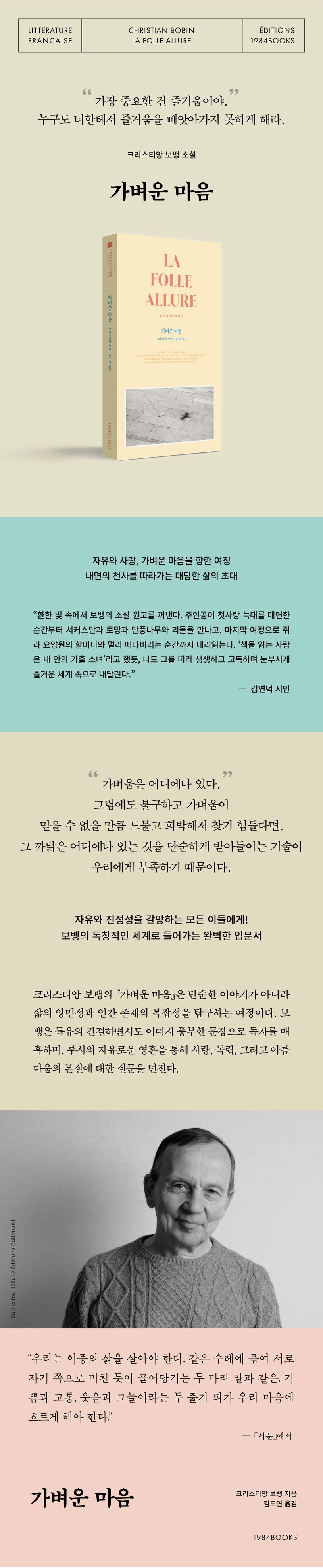 짙은 어두움 속에서도 삶의 환희를 찬양하는 시인이 쓰는 소설은 어떤 모습일까. 독특한 시적 감성과 철학적 통찰이 빛나는 『가벼운 마음』은 자유를 향한 갈망과 삶의 모순된 감정을 섬세하게 그려내며, 크리스티앙 보뱅의 문학 세계를 대표하는 걸작 중 하나로 평가받는다. 보뱅은 특유의 간결하면서도 이미지 풍부한 문장으로 독자를 매혹하고, 주인공 뤼시의 자유로운 영혼을 통해 사랑, 독립, 그리고 아름다움의 본질에 대한 질문을 던진다.