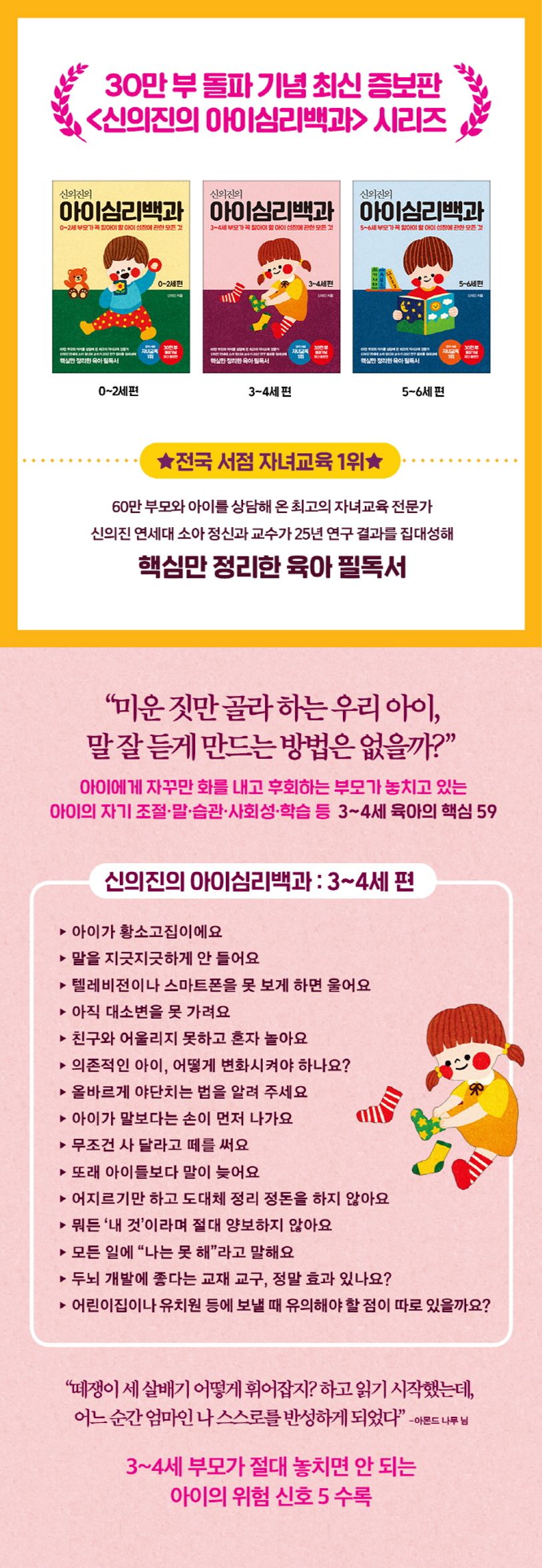 특히30만부돌파기념으로엮은최신증보판에는‘3~4세부모들이절대놓치면안되는아이의위험신호5가지’를수록해,아이의발달상황을자가진단해볼수있도록했다.매일아이와힘겨운전쟁을치르고있는부모를위해현실적이면서도실현가능한답을정리했다.
