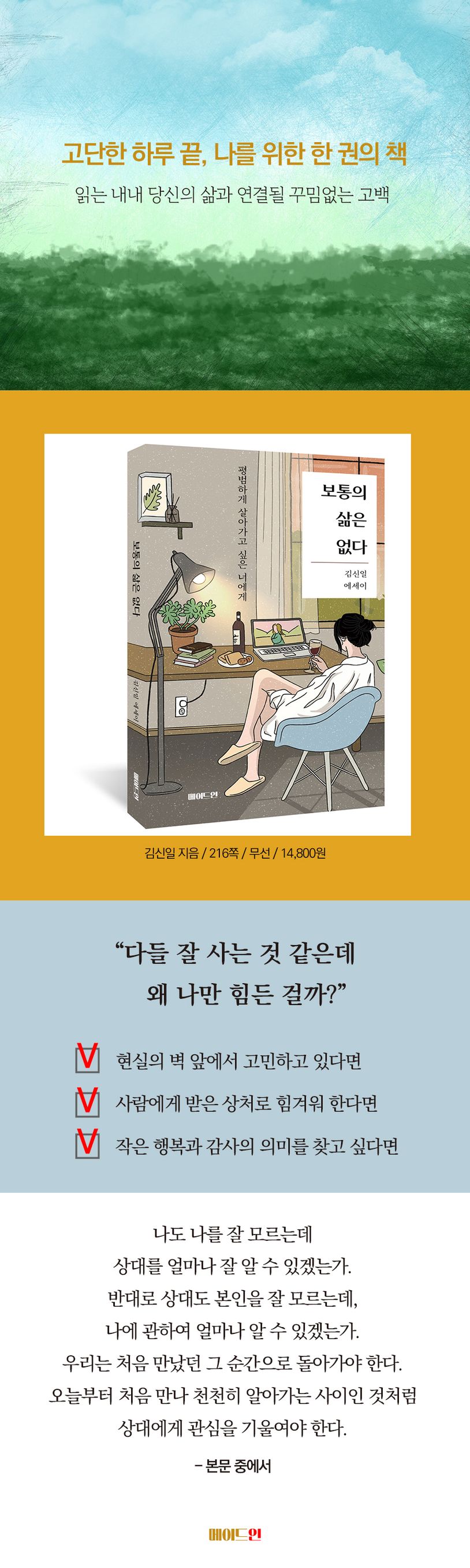 평범해 보이지만 결코 평범하지 않은, 우리 모두의 삶에 따뜻한 공감과 위로, 그리고 다시 살아갈 용기를 건네는 에세이다. 오늘도 버티고 있는 당신을 위한 메시지를 전한다.