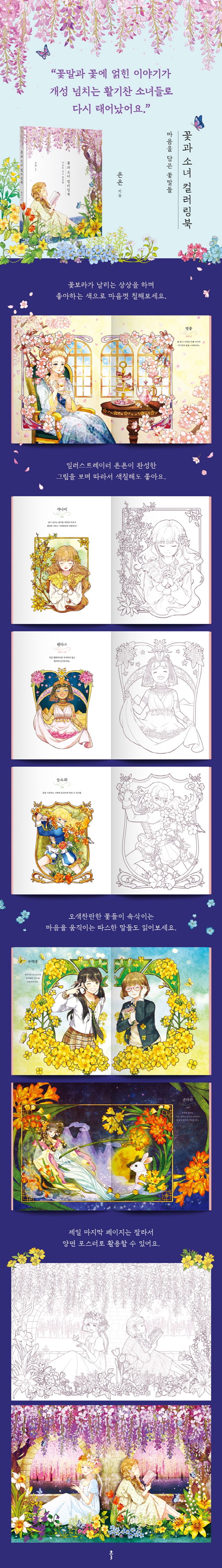 《꽃과 소녀 컬러링북》은 꽃말, 꽃말에 얽힌 이야기, 꽃의 느낌을 일러스트레이터 욘욘이 자신만의 감성으로 재해석하여 사랑스러운 소녀들로 그려낸 컬러링북이다. 개나리, 튤립, 국화처럼 흔히 볼 수 있는 꽃부터 스노드롭, 산씀바귀, 펜타스처럼 조금은 낯선 꽃까지 총 32가지 꽃을 만날 수 있다.