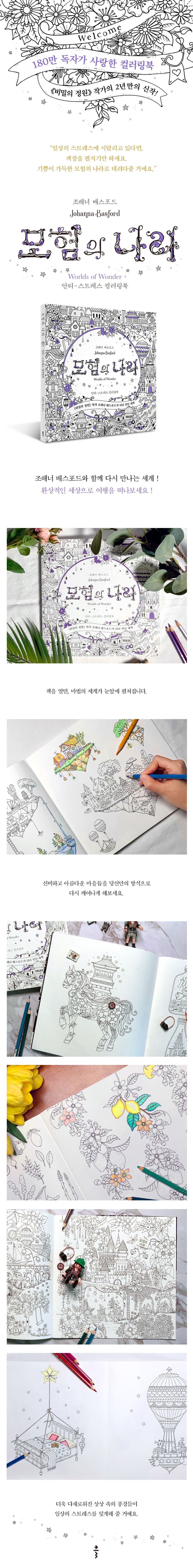 《비밀의 정원》으로 우리나라를 포함해 전 세계에 컬러링북 열풍을 일으킨 조해너 배스포드가 2년 만의 신작으로 돌아왔다. 이번 신작 《모험의 나라》는 ‘신비한 상상 속 세상’을 주제로 다루고 있다. 하늘 위를 떠다니는 섬, 풍선에 매달려 날아다니는 코끼리, 꽃으로 만들어진 바퀴를 단 자전거, 꽃대에 매달려 있는 요정들의 집, 특대형 버섯 주택, 물고기를 타고 달리는 바닷속 마을 등이 독자들의 눈앞에 펼쳐진다. 저자는 이 책이 ‘경이로운 세계로 통하는 마법의 문’과 같다고 표현한다. 그 말대로 책을 접한 이들은 다른 곳으로 통하는 차원의 문을 열고 들어가는 경험을 하게 될 것이다.