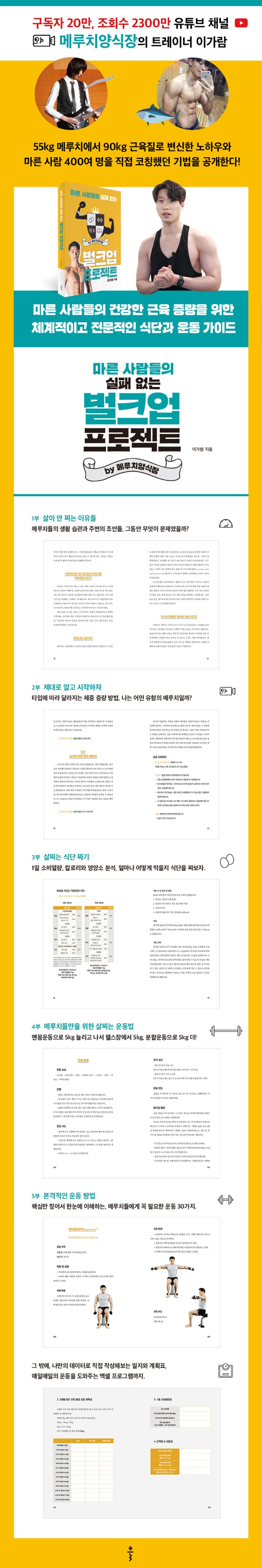 이 책의 시작인 1부에서는 마른 사람들 특유의 생활 습관과 주변의 잘못된 조언들을 살펴보며 마른 사람들이 살이 안 찔 수밖에 없었던 이유들을 찾는다. 그러나 메루치라도 다 같은 메루치는 아니다. 2부에서는 마른 사람들의 유형을 아홉 가지로 나눠 그 특성을 분석하고 그에 따라 달라지는 체중 증량 목표와 방법을 제시한다. 본격적인 식단 관리는 3부에서 다룬다. 1일 소비열량과 칼로리, 영양소 등 기본 지식을 습득한 뒤 실제로 식단을 짜보며 얼마나 어떻게 먹을지를 세세하게 결정해보는 것이다. 4부는 메루치들만을 위한 살찌는 운동 프로그램이다. 맨몸운동, 헬스장 기구 운동, 분할운동으로 이어지는 단계마다 5kg씩 늘려가는 효과적인 방식을 소개한다. 마지막으로 마른 사람들에게 꼭 필요한 운동 30가지를 사진과 함께 명료하게 설명한 5부까지 완독하고 실천한다면, 더 이상 실패하지 않는 건강한 벌크업을 해낼 수 있을 것이다.