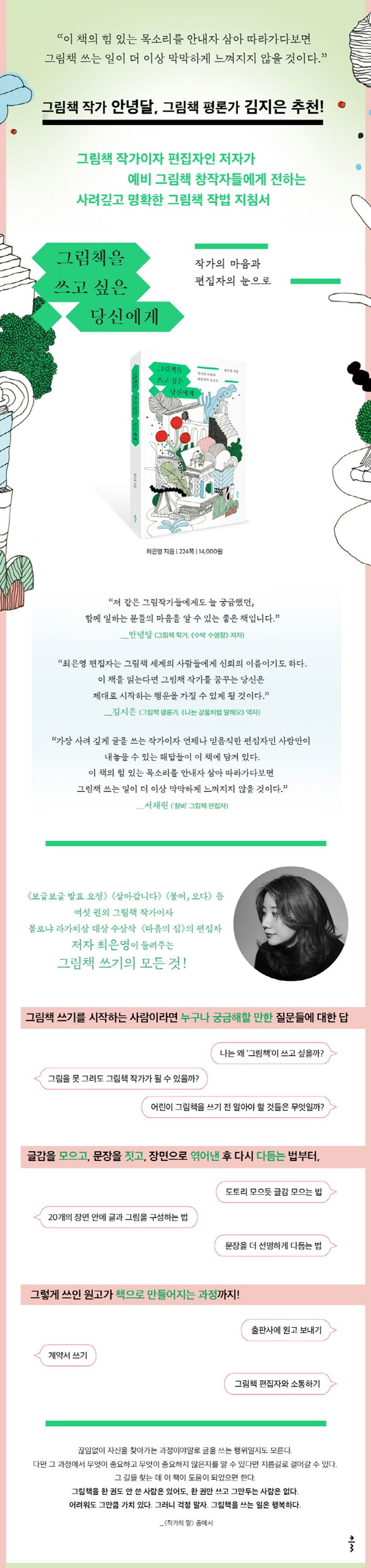 “그림책 세계의 사람들에게 신뢰의 이름”(평론가 김지은)인 저자 최은영의 이 책은 처음 시작하는 이들에게는 훌륭한 지침서가, 이미 그림책 쓰기의 세계에 뛰어든 이들에게는 반가운 동료의 글이자 참고서가 되어줄 것이다.