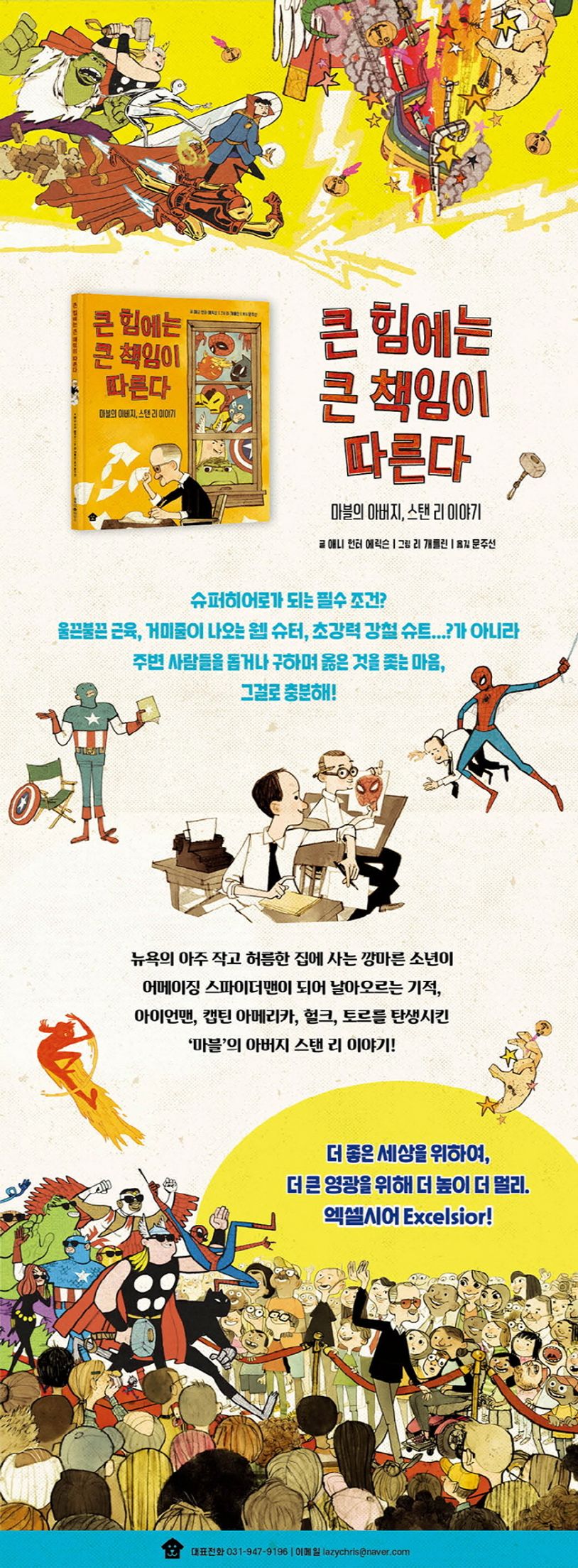 스파이더맨, 아이언맨, 헐크, 닥터 스트레인지, 판타스틱4...이름만으로도 지구를 공격할 엄두가 안 날만큼 강력한 슈퍼히어로들을 만든 사람, 마블 코믹스의 아버지 '스탠 리'의 이야기를 통해 진짜 히어로가 되는 법을 알게 해주는 책입니다. 슈퍼 히어로를 만드는 사람은 과연 더더 엄청난 슈퍼 히어로일까요? 하지만 여기 놀라운 반전이 있습니다.