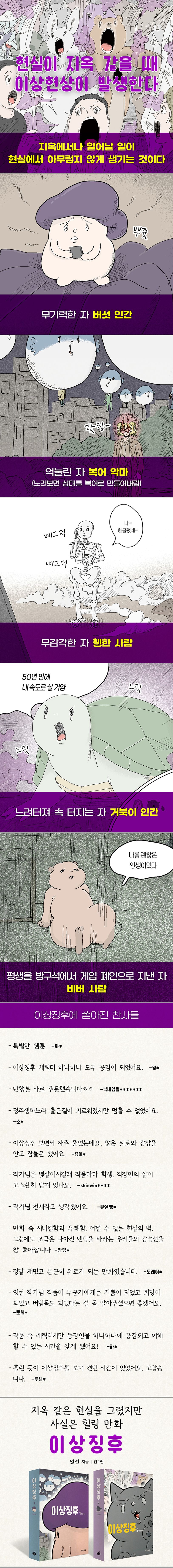 이상현상은 현실이 지옥같이 느껴질 때, 지옥에서 발생할 일이 현실에서 벌어지는 것이다. 무기력증을 심하게 앓다가 버섯으로 변신한 버섯 사람, 성공을 위해 모든 인간관계를 포기하고, 급기야 인간임을 포기하고 허리 아플 일 없는 문어로 변신하는 성공 사람, 세상의 자극에 무감각해지기 위해 돌이 되어버린 돌 사람, 학교 가기 싫어서 학교를 폭파해버리자고 선동하는 학생 악마 등, 21세기 동아시아의 어느 반도에는 이상징후가 가득하다.