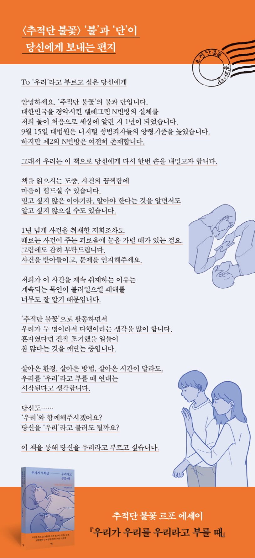 불꽃은, 우리가 관심을 갖지 않는다면 디지털 성범죄는 더욱 잔인한 범죄로 악화될 것을 잘 알기에 책을 통해, 당신에게 한번 더 용기내 손을 내밀기로 했다고 말한다. 불과 단, 두 사람은 이 책에 언론에 보도된 적 없는 N번방 추적기와 자신들의 평범한 이야기를 담았다. N번방 추적기는 1부에, 불과 단의 일상이지만 평범할 수 없었던 이야기는 2부에, 피해자들과의 연대와 대한민국이 나아가야 할 미래는 3부에 담았다. 처음 N번방 사건을 취재하며 공론화하기까지 불꽃은 꽤 오랜 시간 둘이서만 싸워야 했다. 취재하면서 생긴 트라우마는 온전히 둘이서 감당해야 하는 상처였다. 불꽃은 그래도 둘이어서 다행이었다고 말한다.