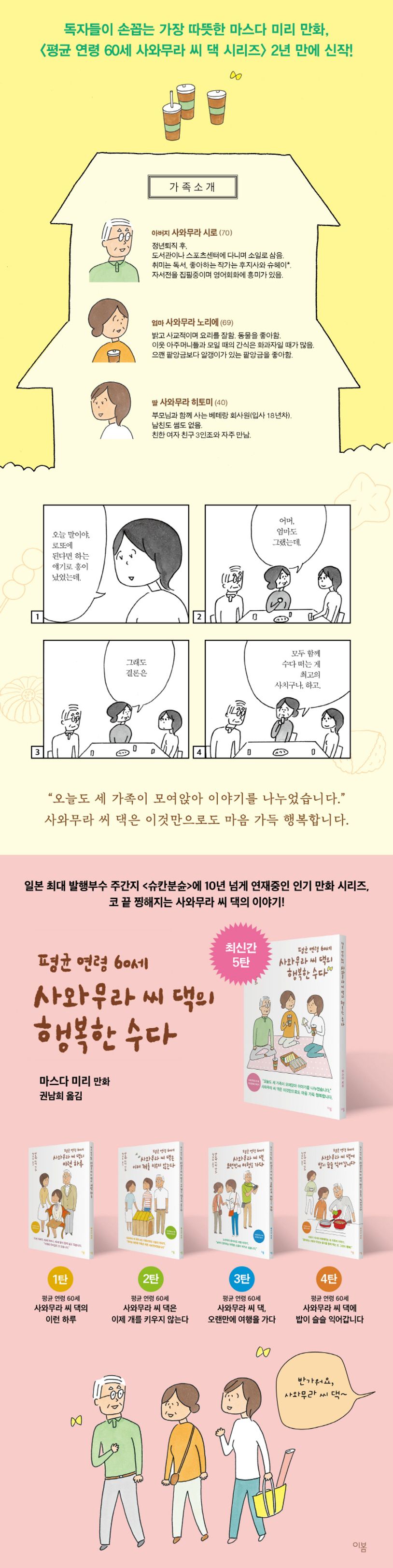 이번에 출간하는 5탄 『사와무라 씨 댁의 행복한 수다』에서 가족들의 나이는 전작 1~4탄과 같다. 정년퇴직을 한 뒤 운동과 영어회화 공부에 열심인 70세 아버지 시로 씨, 요리를 잘하고 사려 깊은 마음을 가진 69세 엄마 노리에 씨, 퇴근 후 동료들과 먹는 맛있는 디저트가 행복인 40세 딸 히토미 씨는 여전히 한집에 살고 있다. 세 사람은 일상에서 변하는 것들과 변하지 않는 것들을 두루 맞이하며 함께 걸어간다. 세 가족 각각의 시선으로 그려진 보통 날들은 ‘맞아 맞아’ 하는 공감과 찡한 감동을 주는 반짝이는 장면들로 가득하다.