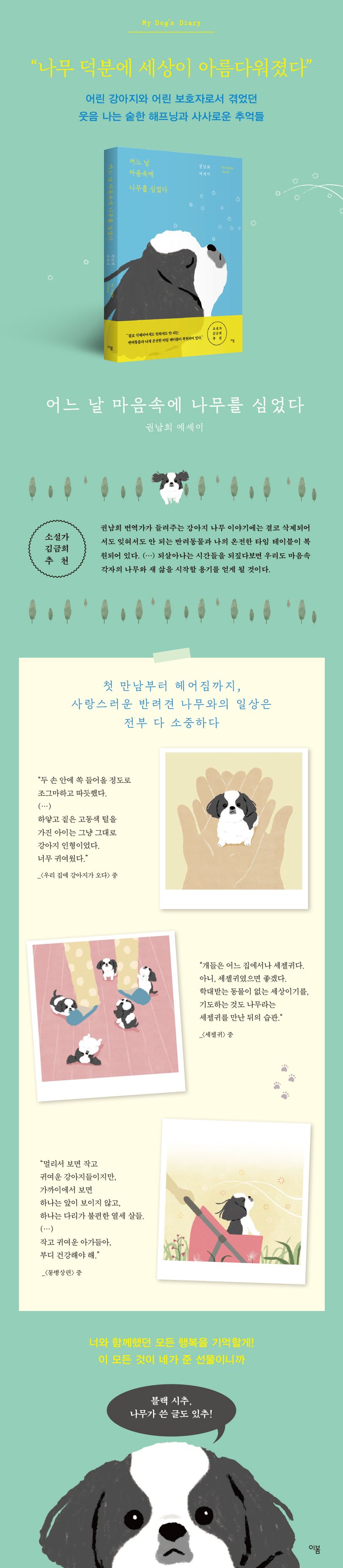 믿고 읽는 번역가이자 유쾌하고 재미있는 에세이스트로서 꾸준한 사랑을 받고 있는 권남희 작가의 반려견 에세이 『어느 날 마음속에 나무를 심었다』가 출간됐다. 권남희 작가의 사랑스런 반려견 ‘나무’는 이미 작가의 블로그를 통해 많은 랜선 이모를 가진 동네 유명견이다. 강아지 ‘나무’와 함께했던 모든 일들이 처음이었던 초보 보호자 권남희 작가는 블로그를 통해 '나무'와의 일상을 공유하며, 동물과 함께 살아가는 방법들을 기록해왔다. 이 책은 블로그에서 인기리에 연재되었던 '나무'의 이야기들과 '나무'가 무지개다리를 건너 뒤, 남은 가족들의 담담하고 가슴 찡한 일상들까지 담고 있다. 더불어 반려견 ‘나무’의 입장에서 쓴 글과 ‘나무’의 또 다른 가족이자 언니인 정하의 마지막 편지를 실었다.