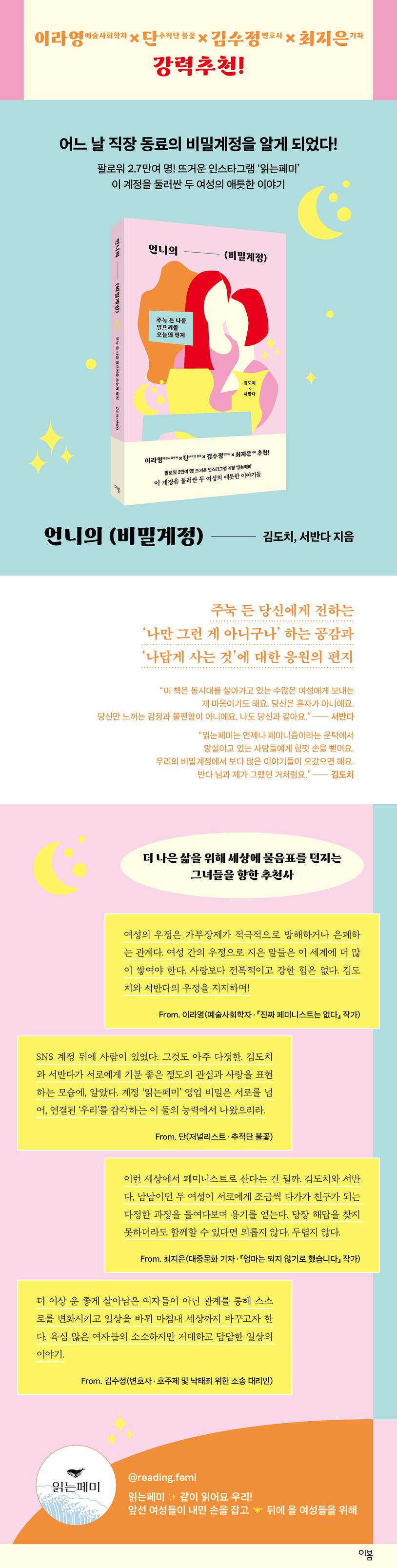 『언니의 비밀계정』은 뜨거운 페미니즘 계정 ‘읽는페미’를 둘러싼 계정 운영자 김도치와 그의 친구 서반다의 이야기를 다루고 있다. 작가 김도치는 평범한 직장인이다. 조금 다른 것이 있다면 낮에는 회사에서, 밤에는 온라인 세상에서 활동한다는 것이다. 누구에게도 들키지 않고, 열심히 이중생활을 하고 있던 어느 날, 성격도 취향도 다른 직장 동료 서반다에게 자신의 비밀계정을 털어놓게 된다. 혼자만 품어오던 비밀이 우리의 비밀이 되는 순간, 직장 동료라는 벽이 허물어지고, 비로소 마음속 깊이 품어온 이야기들이 시작된다. 이 책은 작가 김도치와 서반다의 애틋한 편지들로 이루어져 있다. 이들이 편지로 나누는 이야기들은 얼핏 매우 개인적이고 소소해보이기도 하지만, 자세히 들여다보면 우리 사회가 여성들에게 행하는 차별과 폭력을 돌아보게 한다. 학창시절, 이성 친구의 불쾌한 행동들은 장난이라는 이름으로 넘겨야 했고, 미용몸무게 48킬로그램을 지키기 위해 고군분투한다. 두 사람이 주고받는 낯설지 않은 이야기들을 함께 읽다보면 ‘나만 그런 게 아니구나’ 하는 공감과, ‘나답게 사는 것’에 대한 응원과 희망의 메시지를 만날 수 있다.