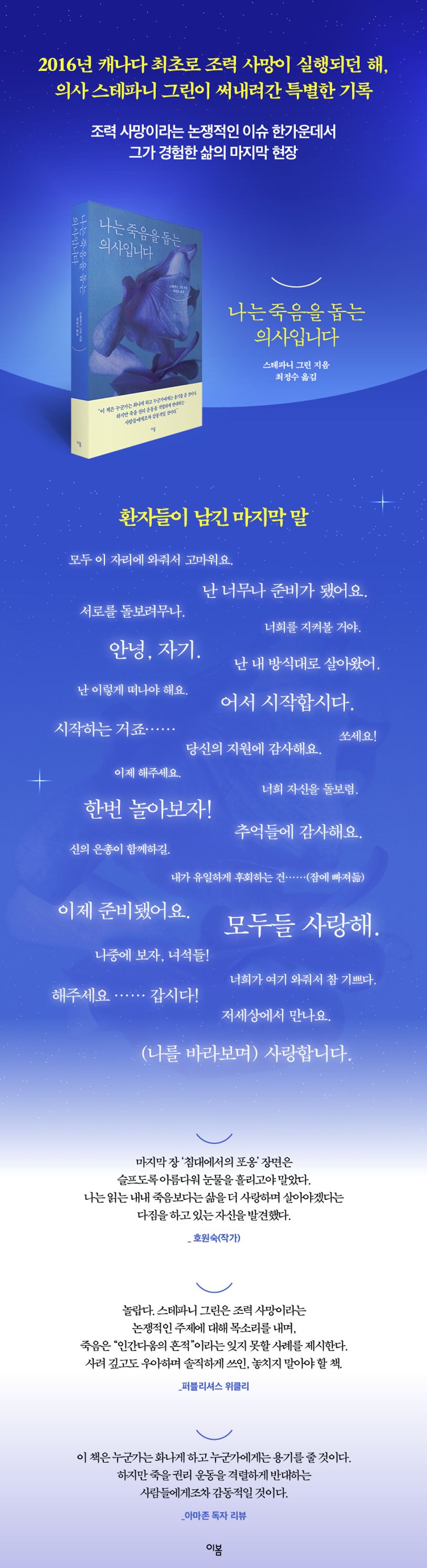 2016년 캐나다 최초로 조력 사망이 실행되던 해, 그 최전선에 있던 스테파니 그린 박사가 쓴 『나는 죽음을 돕는 의사입니다』는 의료조력 사망MAiD의 근접 관찰 보고서로서, 특별한 죽음의 현장을 생생히 전한다. 환자들이 이러한 죽음의 방식을 원하는 이유에서 신청 기준, 시행 절차, 임종의 모습 등이 한 편의 다큐멘터리처럼 펼쳐지는 것이다.