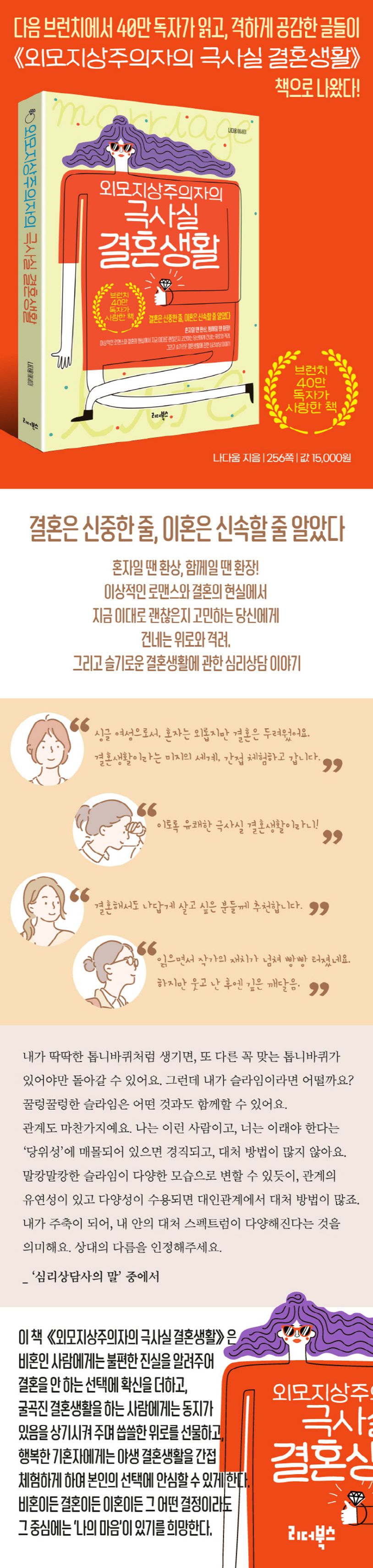 “싱글 여성으로서, 혼자는 외롭지만 결혼은 두려웠어요. 결혼생활이라는 미지의 세계, 간접 체험하고 갑니다.” “결혼해서도 나답게 살고 싶은 분들께 추천합니다.” “읽으면서 작가의 재치가 넘쳐 빵빵 터졌네요. 하지만 웃고 난 후엔 깊은 깨달음.” 브런치에서 이런 댓글이 무수히 달린 《외모지상주의자의 극사실 결혼생활》이 한 권의 책으로 나왔다.