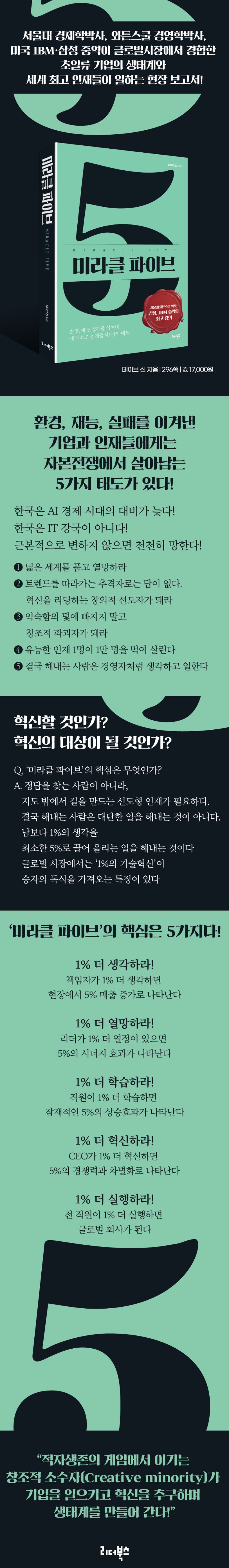 기업 컨설팅과 멤버십 중심 자문, 강연에서 뜨거운 지지와 관심을 받았던 내용과 저자가 세계 최고 인재들과 함께 일하면서 얻은 통찰과 일상의 경험을 망라해 《미라클 파이브》 이 한 권의 책에 담았다. 시대를 이끌어가는 혁신기업과 창업가, 자기 분야에서 정상에 오른 사람들의 독창적인 성공 노하우에서 미라클 파이브의 핵심을 짚어낼 수 있다.