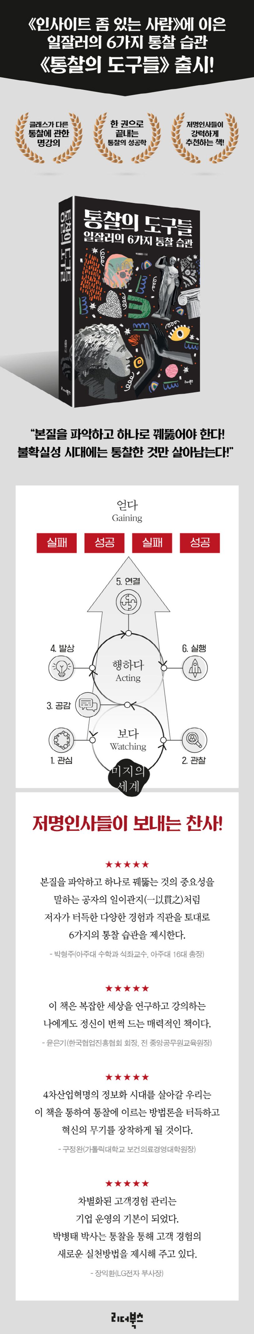 당연한 것과 상식을 뛰어넘어 본질을 꿰뚫는 통찰의 힘을 제시한 《통찰의 도구들》은 박병태 박사가 33년간의 현장 실무와 경험을 통해 체득한 6가지 통찰 비법을 공개한 책이다. 국내 저명인사들은 자신의 분야와 세상의 빠른 변화를 체감하는 모든 이들에게 통찰 매뉴얼인 이 책이 방향타 역할을 하게 될 것이라며 강력하게 추천했다.
