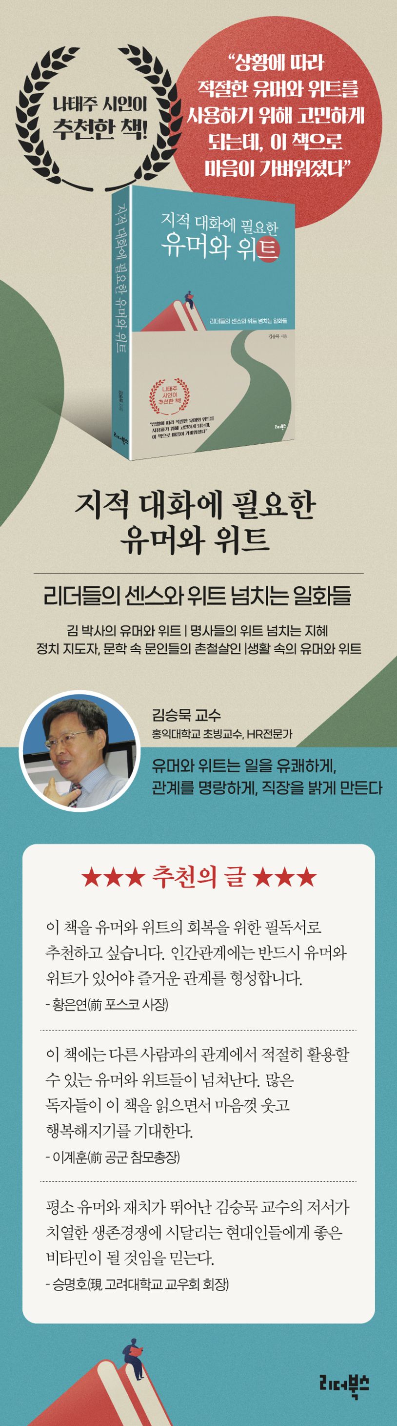 포스코, LG그룹, KSA에서 근무했으며, 인사/교육 분야에 이론과 실무를 겸비한 HR전문가로 인정받는 홍익대 김승묵 교수가 그동안 지적 대화나 강의, 유명인사들과 교분을 쌓으면서 사용한 유머와 위트를 소개한다. 특히 리더, 유명인사, 정치 지도자들의 센스와 위트 넘치는 일화들에서 삶의 지혜를 얻을 수 있고, 문학 속 문인들의 촌철살인, 생활 속의 유머와 위트를 읽다 보면 왜 유머와 위트가 일을 유쾌하게, 관계를 명랑하게, 직장을 밝게 만드는지 알게 될 것이다.