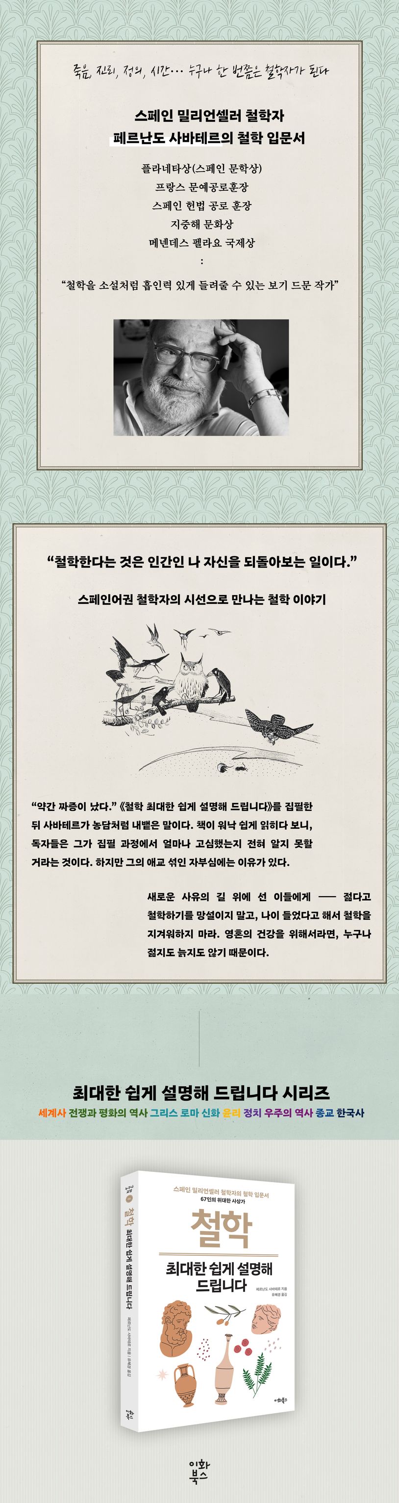 페르난도 사바테르는 30년 넘게 철학을 가르친 교수로 프랑스, 유럽의회, 스페인, 멕시코 등 전세계 여러 나라에서 문화 공로 훈장을 받았다. 이 책은 그가 오랜 시간 학생들과 나눈 질문들, 그리고 누구나 한 번쯤 품었을 철학적 사유를 통찰력 있는 언어로 풀어낸 철학 입문서다. 철학이 던지는 근본적인 질문들은 우리 모두가 한 번쯤 스스로에게 던져봤던 것들이다. 죽음, 진리, 정의, 자연, 시간 같은 본질적인 주제를 중심으로 67인의 위대한 사상가들의 이야기를 들려준다. “철학한다는 것은 인간인 나 자신을 되돌아보는 일이다.”