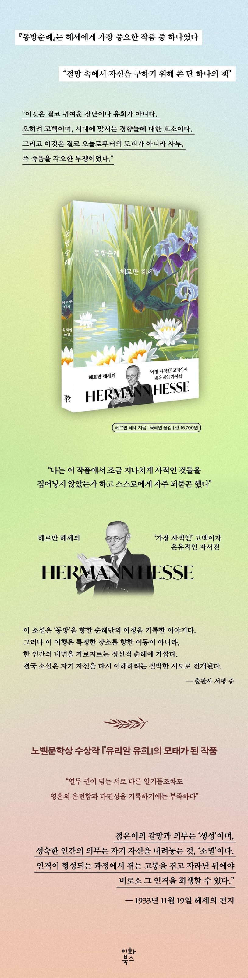 헤세의 모든 글은 본질적으로 매우 개인적이지만, 그가 남긴 주요 작품 가운데서도 이 작품은 ‘가장 사적인’ 작품이다. 헤세는 “나는 이 작품에서 조금 지나치게 사적인 것들을 집어넣지 않았는가 하고 스스로에게 자주 되묻곤 했다”라고 말하기도 했다. 『동방순례』는 노벨문학상 수상작 『유리알 유희』의 모태가 된 작품이다. 이 소설은 ‘동방’을 향한 순례단의 여정을 기록한 이야기다. 그러나 이 여행은 특정한 장소를 향한 이동이 아니라, 한 인간의 내면을 가로지르는 정신적 순례에 가깝다. 결국 소설은 자기 자신을 다시 이해하려는 절박한 시도로 전개된다.