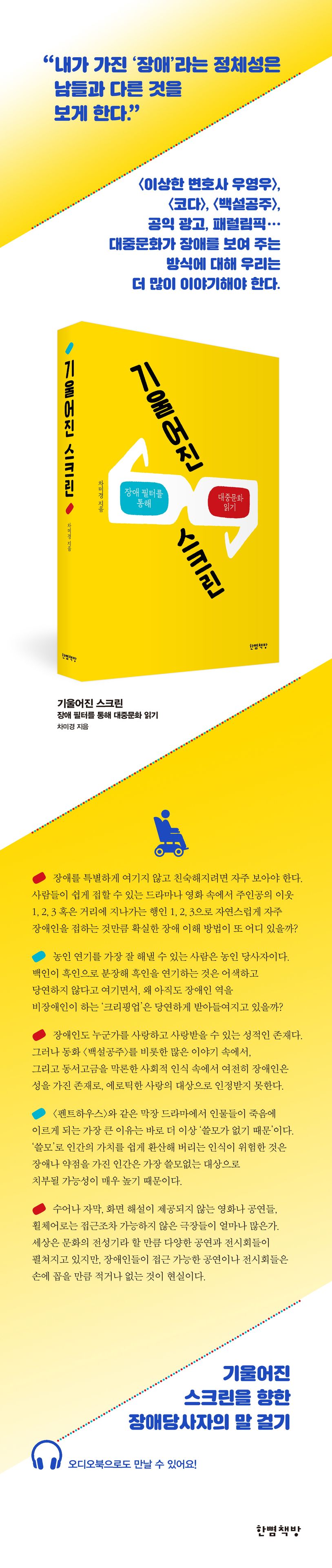 방송작가로, 칼럼니스트로 활약해 온 저자는 ‘장애’라는 정체성이 다양한 대중문화에서도 남들과 다른 것을 보게 한다고 말한다. 드라마, 영화, 소설, 연극, 광고 등에서 장애인은 기울어진 운동장의 낮은 쪽에 자리하고 있는 것이 현실이다. 장애당사자의 눈으로 본 대중문화, 무엇이 문제이고 어떻게 바꾸어 가야 할지 작품들을 통해 이야기한다.