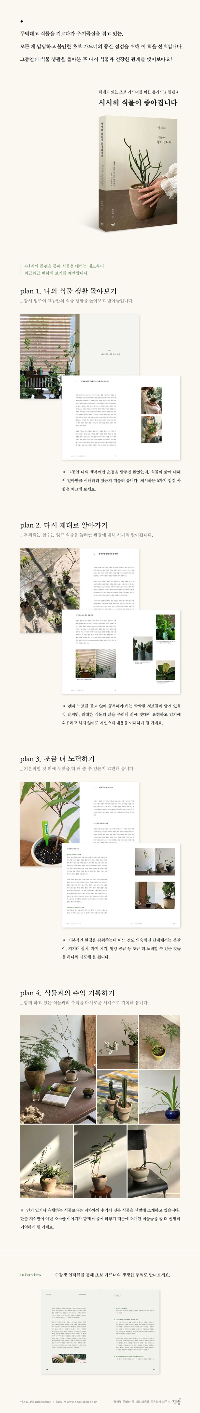 취미를 묻는 질문에 ‘식물 키우기’라는 대답을 하곤 하지만 정작 잘 키우고 있는 건지 마음 한 편이 무겁다면 주목해 주세요. 먼저 식물과 처음 마주한 때를 떠올려 봅니다. 우연히 선물 받아서, SNS나 플랜트숍에서 만난 식물의 외형에 반해서, 막연히 새로운 취미 활동을 해보고 싶단 생각에 식물을 들이진 않았나요? 준비 없이 식물과 함께하게 됐다면 모든 게 생각처럼 쉽지 않을 수 있습니다. 물도 규칙적으로 주고, 햇빛도 쬐어주며 나름의 노력을 하는데도 식물과의 관계가 좀처럼 좋아지지 않아 답답하다면 더 늦기 전에 식물의 삶에 대해 제대로 이해해 보기로 해요.이 책은 무턱대고 식물을 기르다가 우여곡절을 겪고 있는, 모든 게 답답하고 불안한 초보 가드너의 중간 점검을 위한 책입니다. 그동안의 식물 생활을 돌아본 후 다시 식물과 건강한 관계를 맺자는 메시지를 담고 있어요. 'plan 1. 나의 식물 생활 돌아보기 / plan 2. 다시 제대로 알아가기 / plan 3. 조금 더 노력하기 / plan 4. 식물과의 추억 기록하기' 이렇게 4단계의 플랜을 통해 식물을 대하는 태도부터 차근차근 변화해 보기를 제안합니다. 저자와 대화한다는 생각으로 편하게 읽어내려가다 보면 식물이 서서히 좋아지는 경험을 하게 될 겁니다.