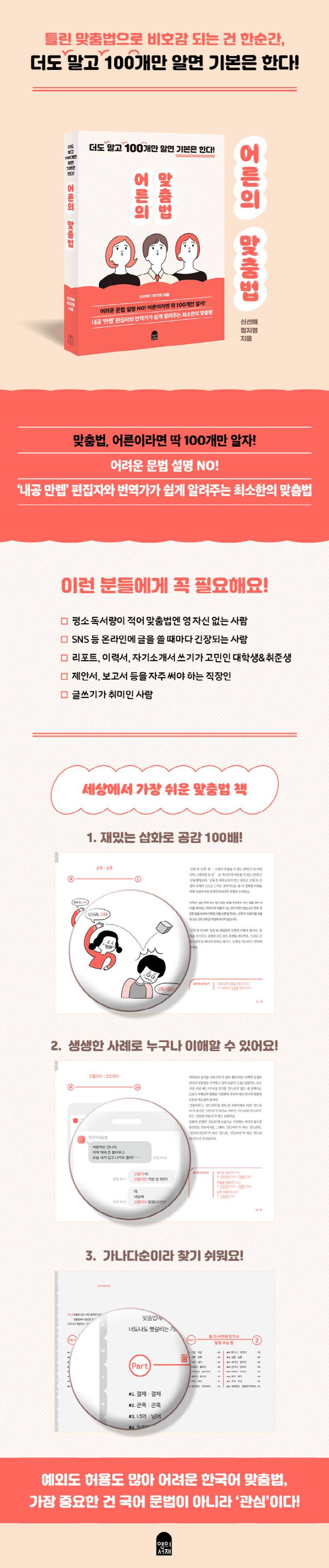 세상에서가장쉬운맞춤법책!맞춤법에서중요한건문법이아니라‘관심’이다예외도허용도많은한국어맞춤법과띄어쓰기,생각만해도벌써답답하고머리가지끈지끈하다.책을편집하고번역하는게직업인이책의저자들도고백한다.“나역시맞춤법을완벽하게꿰지못하는데맞춤법책을써도되는걸까?”무척조심스러웠다고.그만큼어렵다는얘기다.하지만“맞춤법에서가장중요한건문법이아니다”라고도이야기한다.꾸준한관심과확인만이맞춤법을틀리지않는유일한방법이라고입모아외친다.이책이맞춤법오류를바로잡기위한첫걸음이되어줄것이다.어려운문법을하나하나언급하며설명하는두꺼운국어책이아니므로겁먹지말자.사람들이가장헷갈려하는말100가지와소소한기본규칙등을재미있게담았다.가벼운마음으로SNS보듯그림으로먼저보고글을읽어보자.두세번읽으면서올바른표기법을눈으로자연스레익히면된다.순서대로읽지않아도좋다.목차를보면서각자자주헷갈렸던단어들이있는지확인한다음,그페이지부터읽어도아무런문제가없다.1장은‘둘다사전에있으나헷갈려쓰는말’,2장은‘둘다사전에있으나잘못쓰는말’,3장은‘사전에없는데사용하는말’로구성되어있으며,기본맞춤법규정11가지와띄어쓰기규칙10가지도책속부록으로소개한다.가나다순이므로언제든필요할때찾아볼수있다.가볍고작은판형이라가방에휴대하기에도용이하므로맞춤법에익숙해질때까지들고다녀보자.