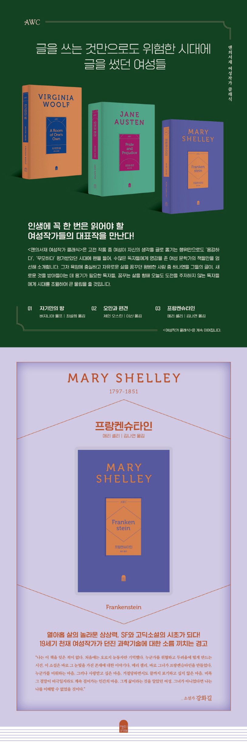 영국 「옵저버」, 미국 「뉴스위크」가 ‘역대 최고의 소설 100’에 선정한 명저이자, SF소설과 고딕소설의 시초가 되는 작품이라고 평가받는 최고의 고전 『프랑켄슈타인』. 그 이름을 모르는 사람도 없지만, 이 작품만큼 오해가 많은 소설도 없다. 우리가 흔히 떠올리는 머리에 못이 박힌 괴물의 모습은 할리우드 영화가 만들어낸 캐릭터일 뿐이며, 프랑켄슈타인도 괴물의 이름이 아니라 그를 창조해낸 이의 이름이다. 더불어 이 소설을 쓴 작가가 메리 셸리라는 여성이라는 사실을 아는 이도 생각보다 드물다.