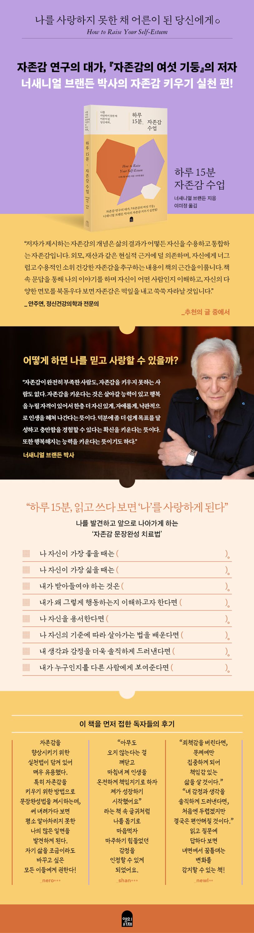 30여 년간 자존감을 주제로 연구해 온 자존감 연구의 선구자, 베스트셀러 『자존감의 여섯 기둥』의 저자, 너새니얼 브랜든의 자존감 향상을 위한 실천적 지침서!