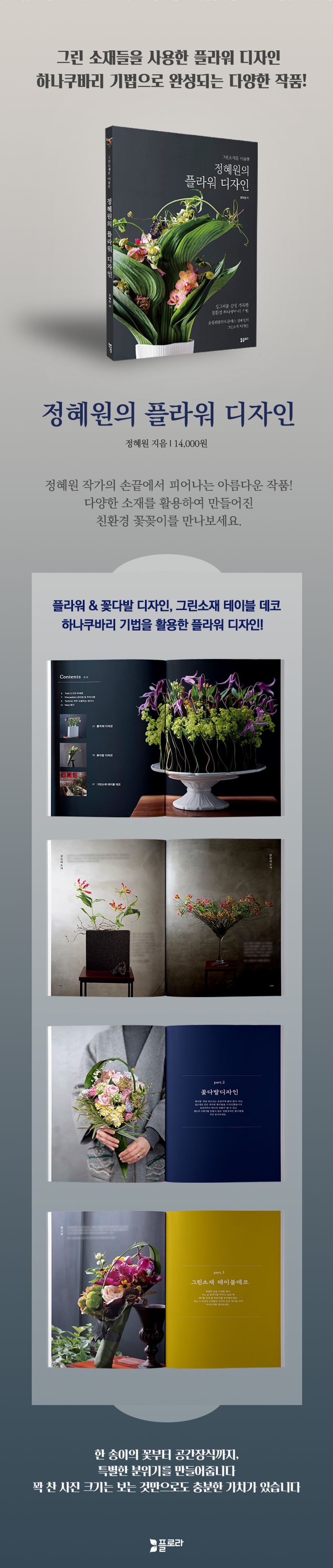 다양한 친환경 플라워 작품을 만들고 활발한 활동을 이어오고 있는 정혜원 작가의 플라워 디자인을 담은 책이다. 잎과 나뭇가지, 줄기, 뿌리, 돌 등 다양한 소재를 사용하여 화병꽂이, 꽃다발, 테이블 데코 디자인을 만나볼 수 있다. 여러 화기에 메인 소재와 부소재들을 어우러지게 장식한 디자인을 만나보자.