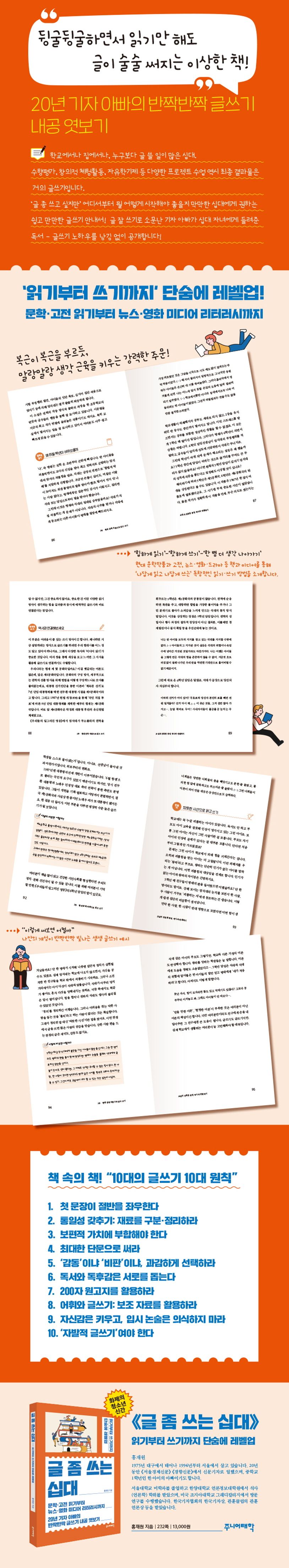 현대 문학작품부터 고전문학, 뉴스·영화·드라마 등 책과 미디어 열네 작품을 통해 ‘나답게 읽고 나답게 쓰는’ 독창적인 읽기·쓰기 방법을 소개하며, 각 과정마다 “이렇게 써보면 어떨까”를 통해 나만의 개성이 빛나는 생생한 글쓰기의 세계로 안내한다. 그리고 ‘한 뼘 더’를 통해, 작품의 핵심적인 주제 외에도 ‘계급’, ‘환경’, ‘격언’, ‘규칙’, ‘작가’, ‘조연’, ‘따뜻한 시선’, ‘결혼’, ‘편견’, ‘인물의 배경’, ‘에피소드’ 등 읽기·쓰기의 다양한 발상과 아이디어와 관점을 제공한다. 나아가 마지막 특별 보너스! 저자의 기자생활 내공을 듬뿍 담은 핵심 비법, “10대의 글쓰기 10대 원칙”을 수록했다