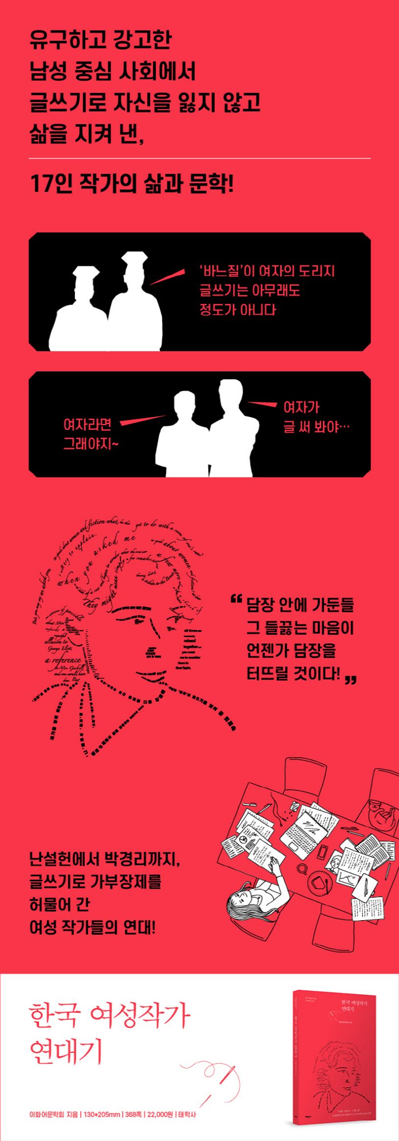 이 책은 난설헌부터 박경리까지 한국 여성작가 17인의 삶과 문학을 다룬다. 작가들은 시대순으로 소개한다. 1부에서는 주로 조선 시대 작가들을 조명했다. 조선 시대는 유교 지배를 받는, 철저한 남성 중심 사회였기 때문에 여성 작가들에 대한 자료며 작품이 거의 남아 있지 않다. 여성이 글을 쓴다는 건 가당치 않은 일로 여겼기 때문이다. 그나마 사고방식이 유연하다는 실학자들조차 “바느질을 하는 것이 부녀의 일이고, 글귀를 수식하고 시로써 이름을 얻는 것은 아무래도 정도(正道)가 아니다”(홍대용)고 단언할 정도였다. 일례로 이들은 당대 동아시아의 중심이었던 중국에서도 극찬한 난설헌을 깎아내리는 일에 하나가 되었다. 그러므로 역설적이게도 작품이 남아 있는 조선 시대 여성 작가들은 가부장제도 어쩌지 못할 만큼 탁월한 문인이었다는 얘기가 된다.