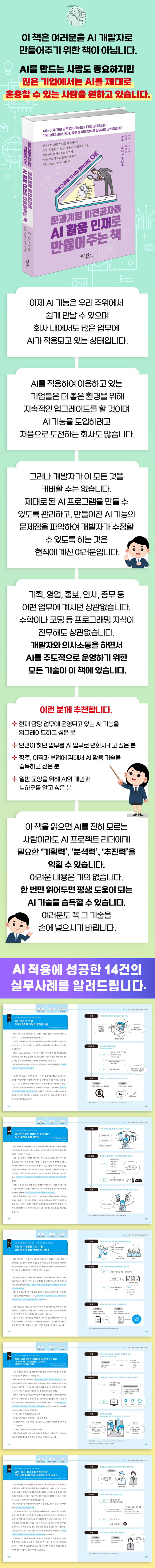 개발자가 아닌 기획, 영업, 홍보, 인사, 총무 등의 일반 업무를 담당하는 사람들이 인공지능을 제대로 이해하고 관리하며, 개발자와 소통하면서 제대로 활용할 수 있는 기술을 설명합니다. 실제로 인공지능을 적용하여 성공한 14개 사례도 소개합니다.