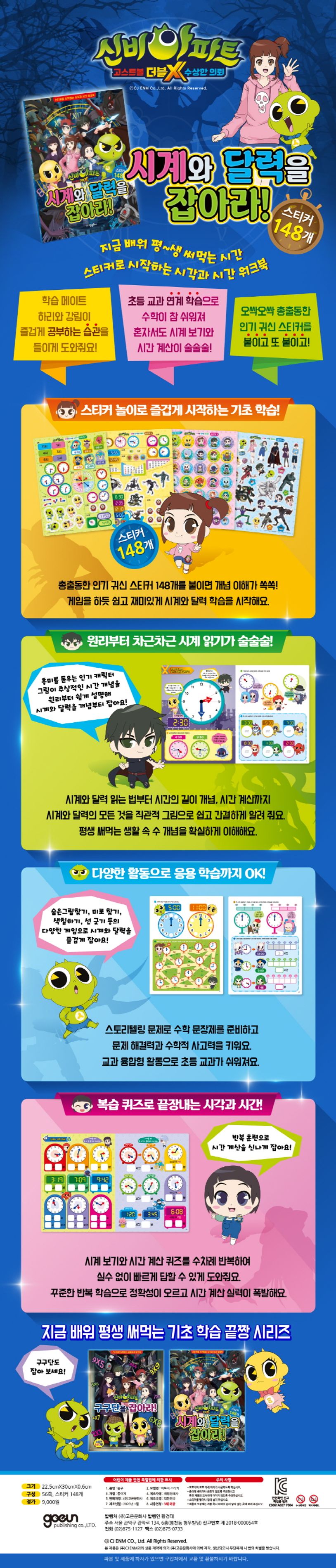 오싹오싹 총출동한 인기 귀신 스티커를 붙이고 또 붙이면 어느덧 시계와 달력 보기, 시간 계산이 술술술! 초등 교과 연계 학습으로 수학이 참 쉬워져 시각 읽기와 시간 계산이 어렵지 않아요! 스티커 붙이기, 숨은그림찾기, 미로 찾기, 암호 풀기, 색칠하기, 선 긋기 등 아이들이 좋아하는 흥미진진한 게임 학습으로 시계와 달력을 놀이하듯 시작해 보세요! 스토리텔링형 학습 게임으로 집중력과 창의력이 발달하고 자신감과 성취감이 샘솟을 거예요. 시계와 달력 읽는 법, 시간의 길이 개념, 시간 계산 등 시계와 달력의 모든 것을 원리와 개념부터 배우고 생활 속 활용 문제, 교과 융합 응용문제로 이어지는 단계 학습 훈련으로 시계와 달력을 한 권으로 모두 끝내요. 시계, 달력, 시간 개념의 기초 이해와 더불어 사고력과 문제 해결력이 자라는 경험을 할 수 있어요. 수학을 어려워하는 아이에게 신비아파트 친구들이 학습 메이트가 되어 즐겁게 공부하는 습관을 들이게 도와줘요. 오싹오싹한 신비아파트 속 인기 귀신과 하리, 강림, 신비와 함께 시계와 달력을 잡아 보세요!