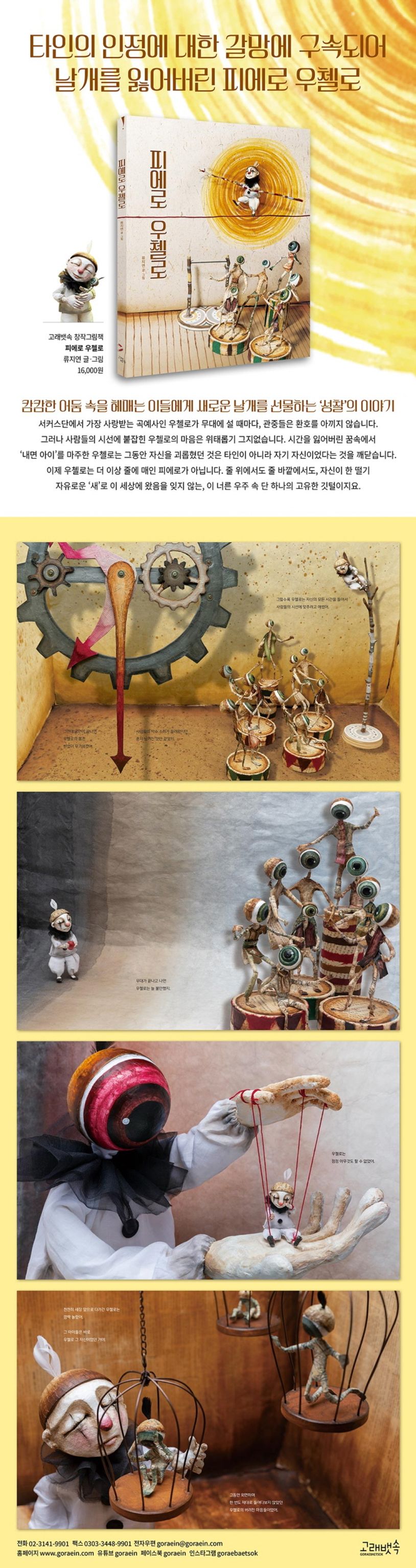 우첼로는 공중 곡예를 하는 피에로입니다. 서커스단에서 가장 사랑받는 곡예사인 우첼로가 무대에 설 때마다, 관중들은 환호를 아끼지 않습니다. 우첼로는 그런 사람들의 시선에 맞추기 위해 온갖 노력을 기울이지요. 시선들에 붙잡힌 우첼로의 마음은 아슬아슬한 줄 위에 선 작은 발만큼이나 위태롭기 그지없습니다. 결국, 무대가 끝나고 난 뒤 우첼로에게 남는 건 깊고 깊은 외로움뿐입니다. 하지만 우첼로의 마음을 위태롭게 만드는 건 비단 사람들의 시선뿐만이 아니었습니다. 무대가 끝나고 난 뒤, 잠깐의 적막이 지나고 나면 어디선가 소곤소곤 들려오는 사람들의 말소리. 들릴 듯 말 듯한 작은 속삭임에 자꾸만 불안하게 귀를 기울이다 보면, 얇게 서린 칼끝이 심장을 깊숙이 찔러 오는 것만 같습니다. 누구보다 사랑받고 인정받고 싶지만 왜인지 그럴수록 두려움과 외로움만 자꾸 커져 가고, 복잡하게 피어오르는 감정의 고리들은 엉킨 실타래가 되어 우첼로를 서서히 옥죄어 옵니다. 줄 위에서 가장 자유로워야 할 우첼로의 몸은 점점 균형과 무중력을 잃어 가고, 그렇게 우첼로의 시간은 멈추어 버리고 맙니다.