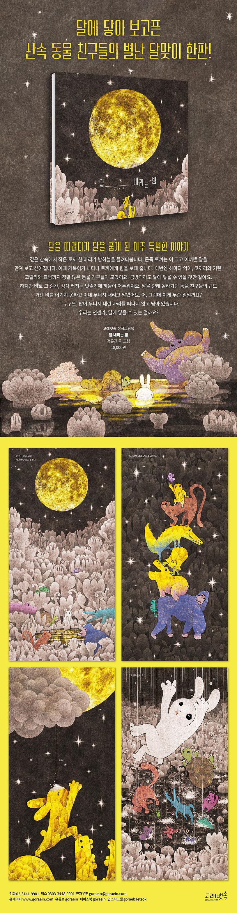 그러자 이번엔 하마와 악어, 코끼리와 기린, 고릴라와 표범까지 정말 많은 동물 친구들이 모였다. 거기에 포르르 날아간 산새의 소식이 닿았는지, 더 많은 친구들이 찾아왔다. 그렇게 모두가 힘을 모아 달을 향해 높이높이 탑을 쌓았더니, 조금만 더 손을 뻗으면 금방이라도 달에 닿을 수 있을 것만 같았다. 하지만 바로 그 순간, 갑작스레 하늘에서 떨어지는 비 한 방울! 점점 커지는 빗줄기에 하늘이 어두워졌다.