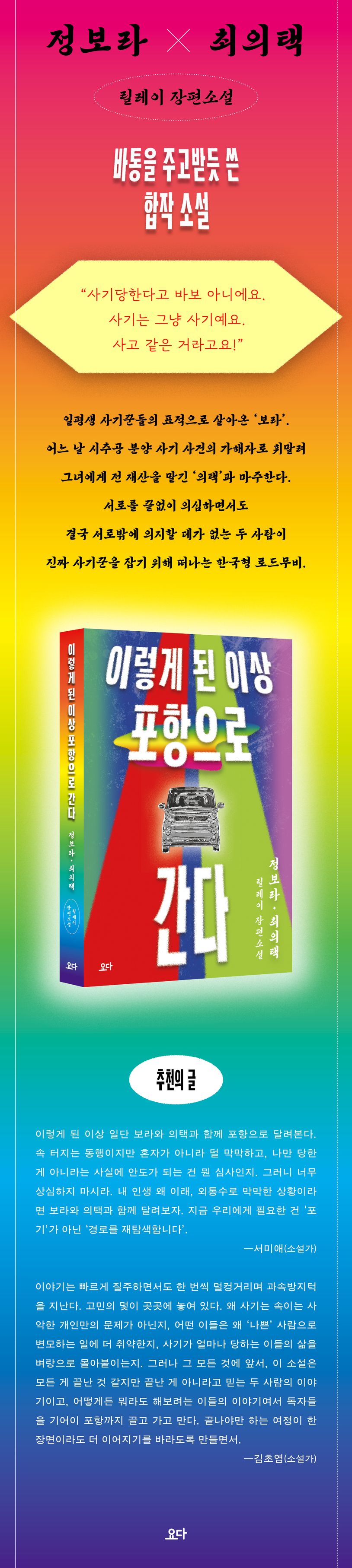 SFㆍ스릴러ㆍ공포 등 다양한 장르를 오가는 두 소설가 정보라와 최의택이 바통을 주고받듯 쓴 미스터리 로드무비다. 하나의 장편을 두 저자가 합작하여 문학 집필 방식의 새 지평을 열었다.