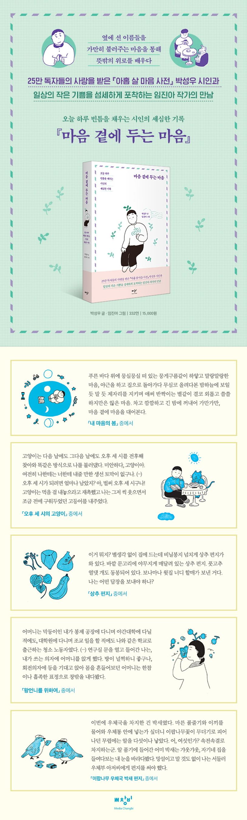 우리마음곁에두는시인의마음,반짝이는하루를응원한다!:시인의감성으로써내려간어른을위한‘마음사전’아이들의마음에특별한이름을붙여준『아홉살마음사전』으로25만독자의사랑을받은박성우시인이5년만의산문집『마음곁에두는마음』(미디어창비)을들고찾아왔다.이번책에서는바쁜일상에찌들어서로의‘마음’을챙길엄두조차내지못하는‘어른’들을위해시인의마음깊이간직한이야기를따뜻하게풀어낸다.시를쓰고싶어운동장에누워깜깜한밤하늘을하염없이바라보던어린시절부터지금여기나를단단하게붙들어주는사람들과의추억까지,일상의소소한풍경일지라도허투루흘려보내지않는시인이그간기대왔던‘선한마음들’의이야기를담았다.그가전하는메시지는분명하다.우리곁의소중한마음들이따듯한손길이되고힘찬걸음이되어오늘날의나를만들어왔다는사실,그렇기에“부디그대들도마음곁에마음을두는일로조금은더반짝이는하루하루를열어가”라는것이다.문득지치고외로운마음이들때펼쳐보는책,박성우의『마음곁에두는마음』은시인의감성으로곱게써내려간어른을위한‘마음사전’‘마음처방전’이다.일상의작은에피소드들속에서어느순간탁하고마음에맺히는생각을시로쓴다는박성우시인은곁에있는이들의고유한마음들을찾아내기억하고다시불러내는일을부지런히반복한다.곁에있는사람들에게도,자신을위해서도‘마음곁에두는마음’을스스럼없이보여주는것만큼마땅한위로는없다는듯이.마음을이정표삼아온시인의이야기가지친마음을포근하게어루만진다.여기에무심한듯부드러운선으로일상의우연한순간을세밀하게포착해내는임진아작가의그림이글마다더해지면서복잡했던마음을가라앉히고말갛고순하게독자들을다독인다.맑고투명하게비치는일상의소소한풍경,어느새스미는다정하고따뜻한위로“요즘같은세상에이렇게착해빠진시인이있다는게그저고마울따름”이라는안도현시인의말처럼,박성우의산문집에서는사람과삶,자연을따듯하게보듬어안으려는시인의마음이고스란히전해진다.시인의집을찾아오는정겨운이웃들은물론이고박새와고양이에게까지다정한눈길이미치지않는곳이없다.1부‘별말없이어깨를’에서는시인의마음속빈틈을채워준‘고마움’이가득하다.첫보이스카우트캠프날집안살림을다안고나타난어머니들덕에뜨끈한밥으로배를채우고(「보이스카우트열전」),청소노동자였던어머니의사랑을받고자라마침내대학교수가된아들이자신의교수실의자에어머니를앉혀본순간을읽다보면우리도언젠가마주했던손길들의온도를가만히떠올려보게된다(「왕언니를위하여」).2부‘마음안쪽에도꽃길이’는마음한편에오래두고싶은장면들이스친다.오후세시를전후해찾아오는고양이에게‘오후세시의고양이’라부르며자연스레비린것을사들고집으로돌아올만큼친하게지내다너무가까워져생기는어려움과불편함을토로하고(「거리를좀두고지내면어떨까요」),외할머니와함께자란딸아이와모처럼나선소풍을행복하게즐기며이좋은걸왜진작하지못했을까후회도하며작은기쁨들을오롯이누리는시인의모습이그려진다(「방금전에온거였으면」).3부‘같이밥을먹는일’에서는온화한자연안에서시인이찾은‘쉼’이보인다.시인이보름달과초승달을보며쓴‘이밤에유일한저탈출구’‘어둠돌돌말아청한저새우잠,/누굴못잊어야윈등만자꾸움츠리나’라는시를읽다보면머릿속을가득채웠던걱정에서한발짝거리를두게된다(「보름달과초승달」).늦여름새벽,청보랏빛도라지꽃을보며‘영원한사랑’이라는도라지꽃의꽃말을떠올리는시인의모습이자연의정취를고스란히전하기도한다(「청보라도라지꽃」).4부‘앵두나무같은사람’에는단단한오늘을만든‘슬픔’의기록이담겼다.새벽에트럭을몰고두부장사를했던일을떠올리며스스로가대견했던지난날을추억하기도하고(「두부」),눈이많이오던날아버지를돕겠다는어린마음에운수회사에다니던아버지를찾아갔지만,아버지의단호한만류로돌아서왔던일등눈물겨웠지만따스함이함께했던그시절에뒤늦은안부를전한다(「흰밤흰눈」).또오랜시간백석을짝사랑해온안도현시인에게서애정하는것에온마음을다하는자세를배우기도하고,삼십여년의나이차에도불구하고격의없이대해주는정양시인으로부터든든한버팀목같은우정을느끼기도한다(「어찌이케늦게완?」「양이형,선생님」).시인의산문집은시인의시를닮았다.내가아닌다른존재로부터귀한깨달음을얻으며삶을같이나누고살아가는모습이시인의글마다투명하게비친다.만나온이들의표정을가볍게보내지않고하나하나마음에새기는시인의세심한시선을따라가다보면,미처발견하지못했던행복의모습을만나게된다.그리고그것이시인만의것이아닌,우리가잊고있었던삶의진실임을가슴깊이느끼게된다.『마음곁에두는마음』을통해박성우시인은무심한표정으로살아가는어른들에게소중한날들의마음을잊지말라고권한다.그마음이란무엇일까?시인은“마음은어둑어둑위태로운곳에두지않고높고환한곳에두는것.닫힌쪽에두지않고밝고넓게열린쪽에두는것.조금은더따뜻하고조금은더아늑하고조금은더아름